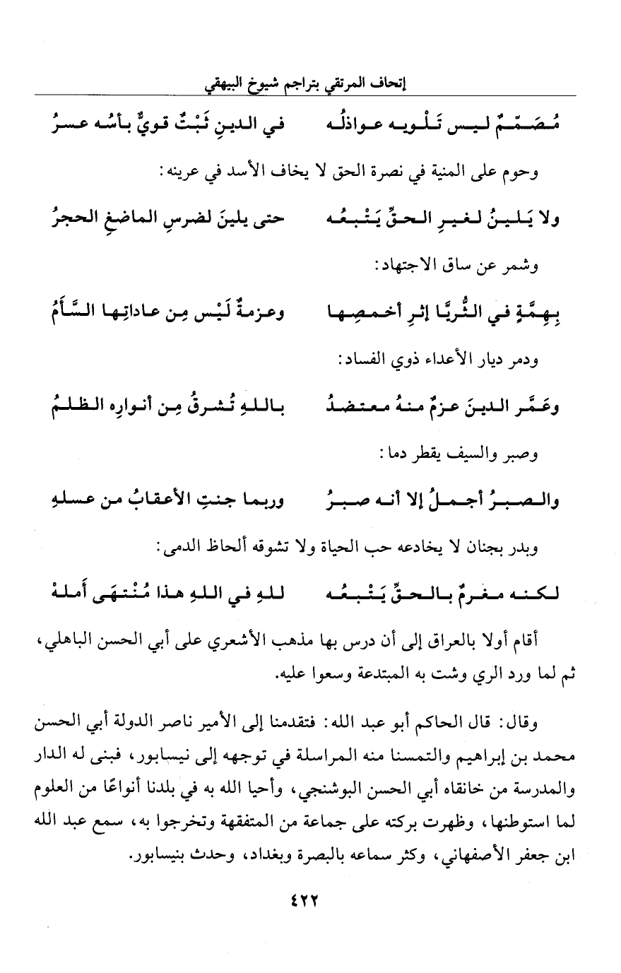 وقال: قال الحاكم أبو عبد الله: فتقدمنا إلى الأمير ناصر الدولة أبي الحسن محمَّد بن إبراهيم والتمسنا منه المراسلة في توجهه إلى نيسابور، فبنى له الدار والمدرسة من خانقاه أبي الحسن البوشنجي، وأحيا الله به في بلدنا أنواعًا من العلوم لما استوطنها، وظهرت بركته على جماعة من المتفقهة وتخرجوا به، سمع عبد الله ابن جعفر الأصفهاني، وكثر سماعه بالبصرة وبغداد، وحدث بنيسابور.