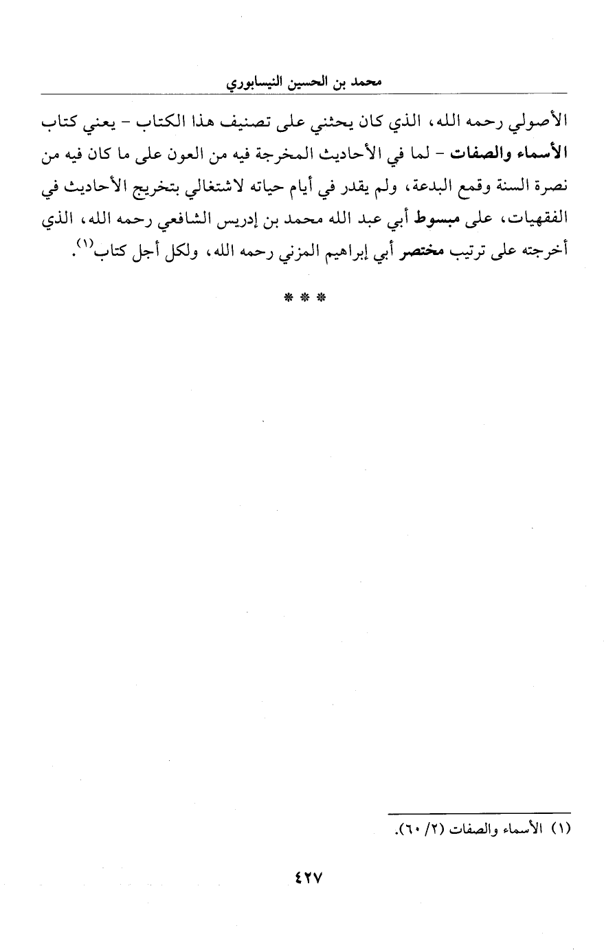 الأصولي رحمه الله، الذي كان يحثني على تصنيف هذا الكتاب -يعني كتاب الأسماء والصفات- لما في الأحاديث المخرجة فيه من العون على ما كان فيه من نصرة السنة وقمع البدعة، ولم يقدر في أيام حياته لاشتغالي بتخريج الأحاديث في الفقهيات، على مبسوط أبي عبد الله محمَّد بن إدريس الشافعي رحمه الله، الذي أخرجته على ترتيب مختصر أبي إبراهيم المزني رحمه الله، ولكل أجل كتاب (¬1).