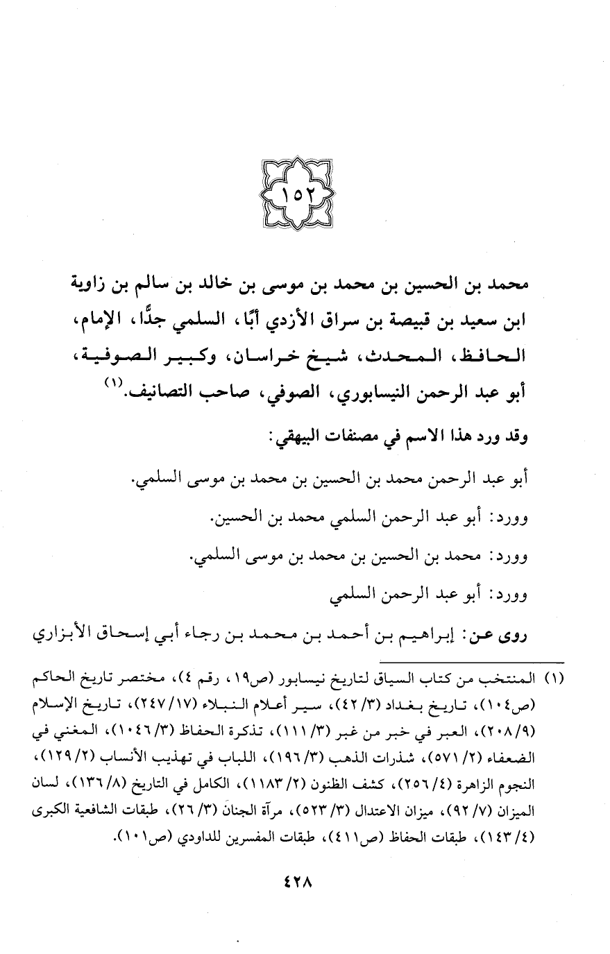 (152) محمَّد بن الحسين بن محمَّد بن موسى بن خالد بن سالم بن زاوية ابن سعيد بن قبيصة بن سراق الأزدي أبا، السلمي جدًّا، الإِمام، الحافظ، المحدث، شيخ خراسان، وكبير الصوفية، أبو عبد الرحمن النيسابوري، الصوفي، صاحب التصانيف. (¬1)