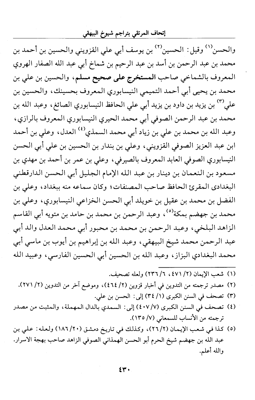 والحسن (¬1) وقيل: الحسين (¬2) بن يوسف أبي علي القزويني والحسين بن أحمد بن محمَّد بن عبد الرحمن بن أسد بن عبد الرحيم بن شماخ أبي عبد الله الصفار الهروي المعروف بالشماخي صاحب المستخرج على صحيح مسلم، والحسين بن علي بن محمَّد بن يحيى أبي أحمد التميمي النيسابوري المعروف بحسينك، والحسين بن علي (¬3) بن يزيد بن داود بن يزيد أبي علي الحافظ النيسابوري الصائغ، وعبد الله بن محمَّد بن عبد الرحمن الصوفي أبي محمَّد الحيري النيسابوري المعروف بالرازي، وعبد الله بن محمَّد بن علي بن زياد أبي محمَّد السمذي (¬4) العدل، وعلي بن أحمد ابن عبد العزيز الصوفي القزويني، وعلي بن بندار بن الحسين بن علي أبي الحسن النيسابوري الصوفي العابد المعروف بالصيرفي، وعلي بن عمر بن أحمد بن مهدي بن مسعود بن النعمان بن دينار بن عبد الله الإِمام الجليل أبي الحسن الدارقطني البغدادى المقرئ الحافظ صاحب المصنفات؛ وكان سماعه منه ببغداد، وعلي بن الفضل بن محمَّد بن عقيل بن خويلد أبي الحسن الخزاعي النيسابوري، وعلي بن محمَّد بن جهضم بمكة (¬5)، وعبد الرحمن بن محمَّد بن حامد بن متويه أبي القاسم الزاهد البلخي، وعبد الرحمن بن محمَّد بن محبور أبي محمَّد العدل والد أبي عبد الرحمن محمَّد شيخ البيهقي، وعبد الله بن إبراهيم بن أيوب بن ماسي أبي محمَّد البغدادي البزاز، وعبد الله بن الحسين أبي الحسين الفارسي، وعبيد الله