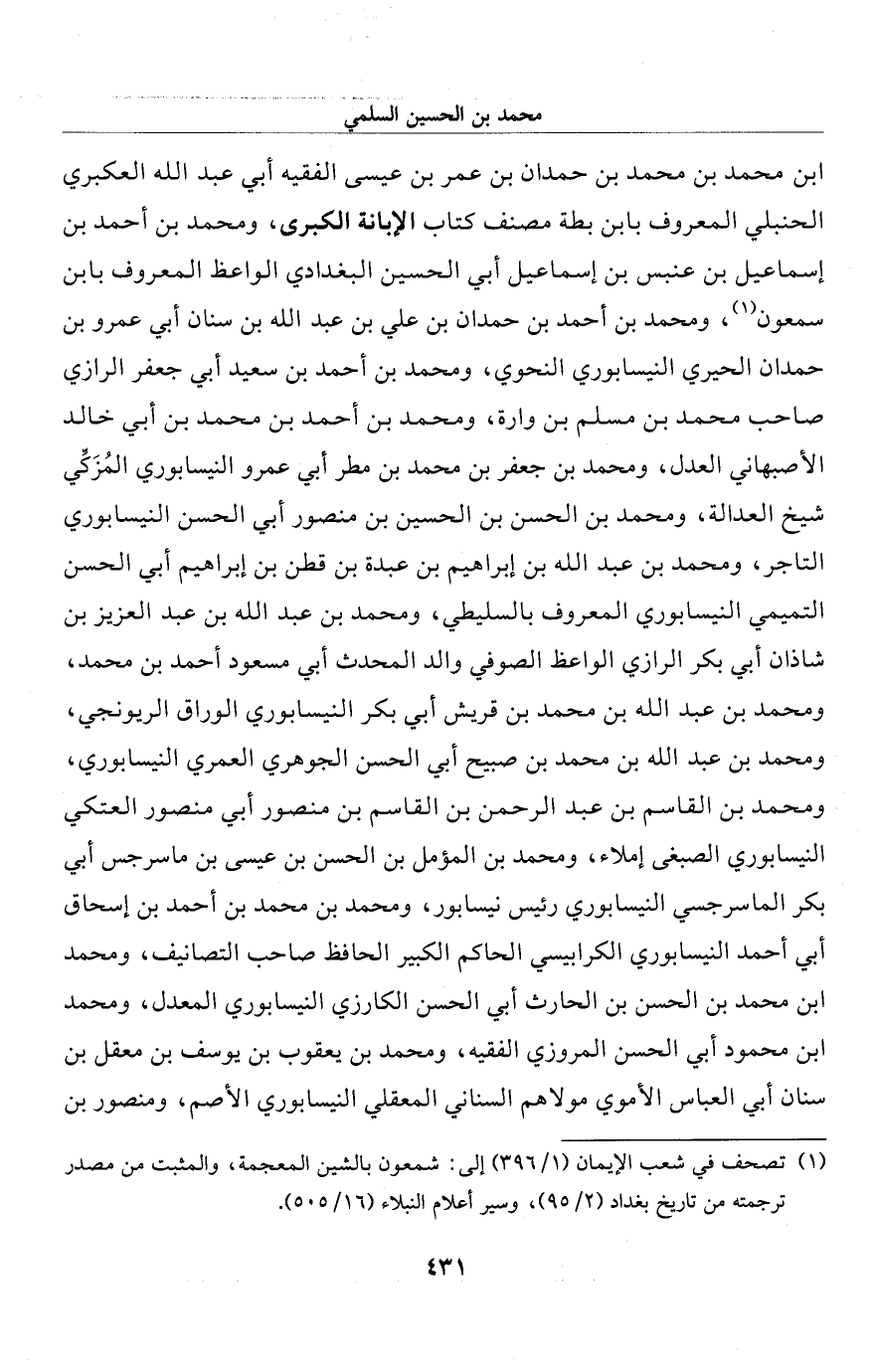 ابن محمَّد بن محمَّد بن حمدان بن عمر بن عيسى الفقيه أبي عبد الله العكبري الحنبلي المعروف بابن بطة مصنف كتاب الإبانة الكبرى, ومحمَّد بن أحمد بن إسماعيل بن عنبس بن إسماعيل أبي الحسين البغدادي الواعظ المعروف بابن سمعون (¬1)، ومحمَّد بن أحمد بن حمدان بن علي بن عبد الله بن سنان أبي عمرو بن حمدان الحيري النيسابوري النحوي، ومحمَّد بن أحمد بن سعيد أبي جعفر الرازي صاحب محمَّد بن مسلم بن وارة، ومحمَّد بن أحمد بن محمَّد بن أبي خالد الأصبهاني العدل، ومحمَّد بن جعفر بن محمَّد بن مطر أبي عمرو النيسابوري المُزَكِّي شيخ العدالة، ومحمَّد بن الحسن بن الحسين بن منصور أبي الحسن النيسابوري التاجر، ومحمَّد بن عبد الله بن إبراهيم بن عبدة بن قطن بن إبراهيم أبي الحسن التميمي النيسابوري المعروف بالسليطي، ومحمَّد بن عبد الله بن عبد العزيز بن شاذان أبي بكر الرازي الواعظ الصوفي والد المحدث أبي مسعود أحمد بن محمَّد، ومحمَّد بن عبد الله بن محمَّد بن قريش أبي بكر النيسابوري الوراق الريونجي، ومحمَّد بن عبد الله بن محمَّد بن صبيح أبي الحسن الجوهري العمري النيسابوري، ومحمَّد بن القاسم بن عبد الرحمن بن القاسم بن منصور أبي منصور العتكي النيسابوري الصبغى إملاء، ومحمَّد بن المؤمل بن الحسن بن عيسى بن ماسرجس أبي بكر الماسرجسي النيسابوري رئيس نيسابور، ومحمَّد بن محمَّد بن أحمد بن إسحاق أبي أحمد النيسابوري الكرابيسي الحاكم الكبير الحافظ صاحب التصانيف، ومحمَّد ابن محمَّد بن الحسن بن الحارث أبي الحسن الكارزي النيسابوري المعدل، ومحمَّد ابن محمود أبي الحسن المروزي الفقيه، ومحمَّد بن يعقوب بن يوسف بن معقل بن سنان أبي العباس الأموي مولاهم السناني المعقلي النيسابوري الأصم، ومنصور بن