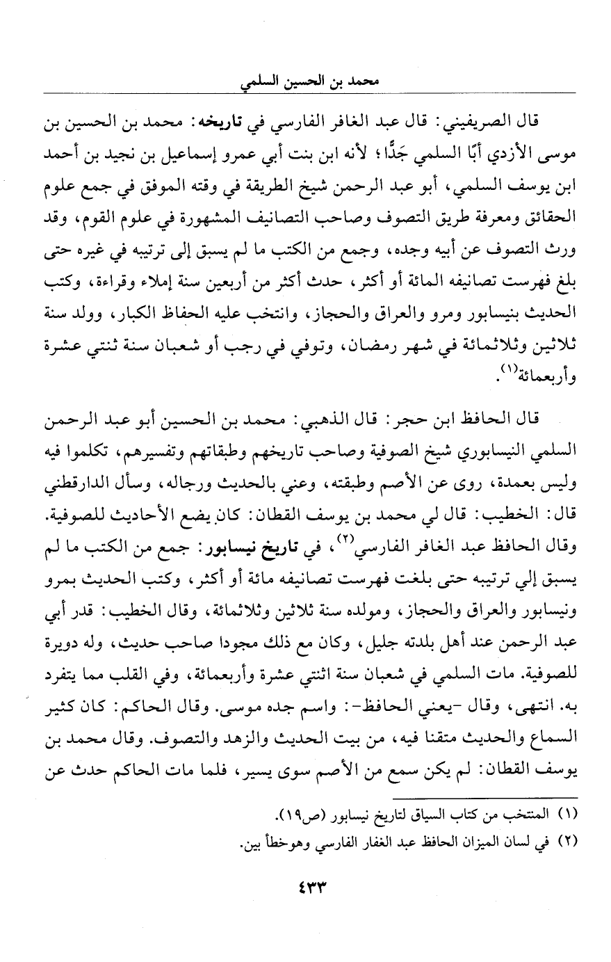 قال الصريفيني: قال عبد الغافر الفارسي في تاريخه: محمَّد بن الحسين بن موسى الأزدي أبًا السلمي جَدًّا؛ لأنه ابن بنت أبي عمرو إسماعيل بن نجيد بن أحمد ابن يوسف السلمي، أبو عبد الرحمن شيخ الطريقة في وقته الموفق في جمع علوم الحقائق ومعرفة طريق التصوف وصاحب التصانيف المشهورة في علوم القوم، وقد ورث التصوف عن أبيه وجده، وجمع من الكتب ما لم يسبق إلى ترتيبه في غيره حتى بلغ فهرست تصانيفه المائة أو أكثر، حدث أكثر من أربعين سنة إملاء وقراءة، وكتب الحديث بنيسابور ومرو والعراق والحجاز، وانتخب عليه الحفاظ الكبار، وولد سنة ثلاثين وثلاثمائة في شهر رمضان، وتوفي في رجب أو شعبان سنة ثنتي عشرة وأربعمائة (¬1).