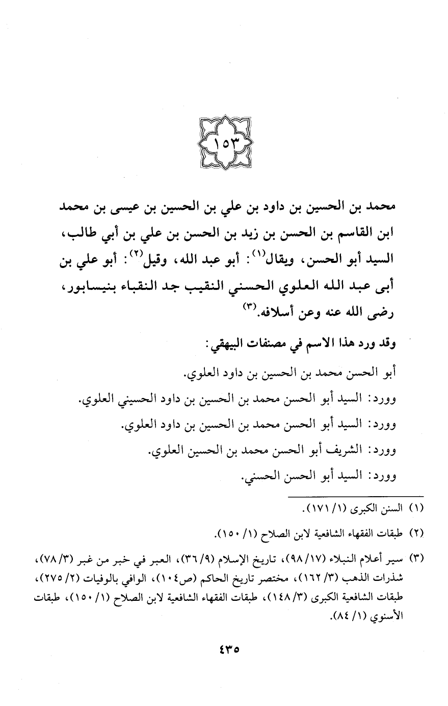 (153) محمَّد بن الحسين بن داود بن علي بن الحسين بن عيسى بن محمَّد ابن القاسم بن الحسن بن زيد بن الحسن بن علي بن أبي طالب، السيد أبو الحسن، ويقال (¬1): أبو عبد الله، وقيل (¬2): أبو علي بن أبى عبد الله العلوي الحسني النقيب جد النقباء بنيسابور، رضي الله عنه وعن أسلافه. (¬3)