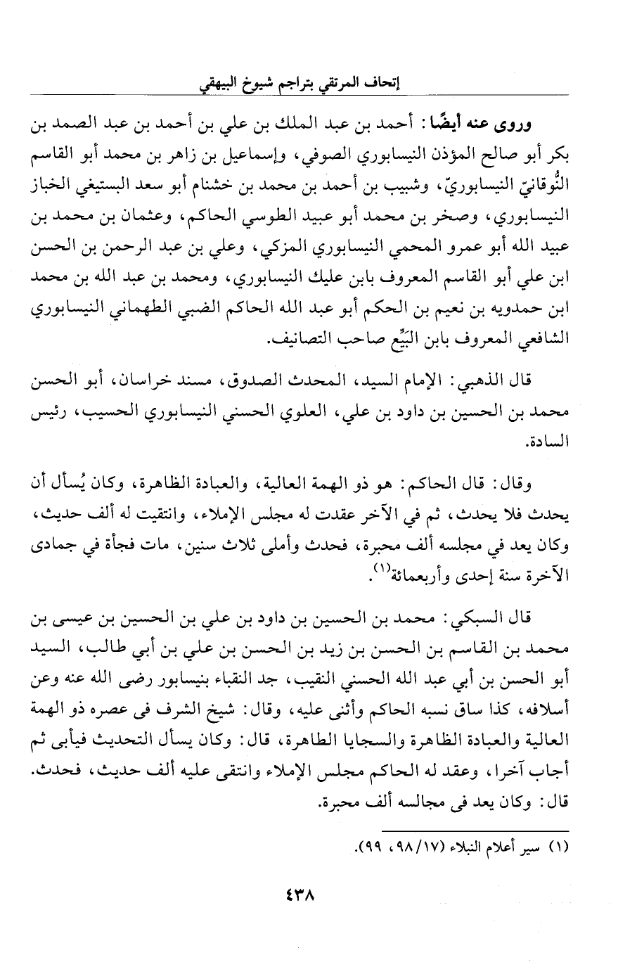 قال الذهبي: الإِمام السيد، المحدث الصدوق، مسند خراسان، أبو الحسن محمَّد بن الحسين بن داود بن علي، العلوي الحسني النيسابوري الحسيب، رئيس السادة.