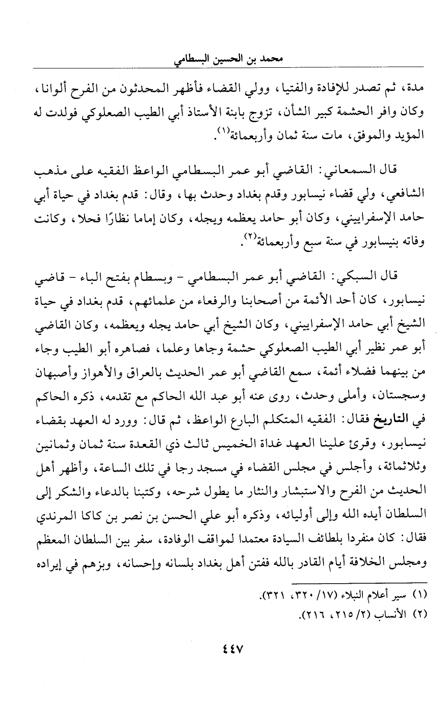 قال السمعاني: القاضي أبو عمر البسطامي الواعظ الفقيه على مذهب الشافعي، ولي قضاء نيسابور وقدم بغداد وحدث بها، وقال: قدم بغداد في حياة أبي حامد الإسفراييني، وكان أبو حامد يعظمه ويجله، وكان إماما نظارًا فحلا، وكانت وفاته بنيسابور في سنة سبع وأربعمائة (¬2).