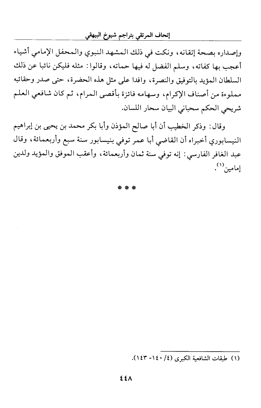 وقال: وذكر الخطيب أن أبا صالح المؤذن وأبا بكر محمَّد بن يحيى بن إبراهيم النيسابوري أخبراه أن القاضي أبا عمر توفي بنيسابور سنة سبع وأربعمائة، وقال عبد الغافر الفارسي: إنه توفي سنة ثمان وأربعمائة، وأعقب الموفق والمؤيد ولدين إمامين (¬1).