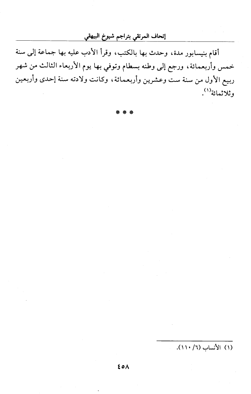 أقام بنيسابور مدة، وحدث بها بالكتب، وقرأ الأدب عليه بها جماعة إلى سنة خمس وأربعمائة، ورجع إلى وطنه بسطام وتوفي بها يوم الأربعاء الثالث من شهر ربيع الأول من سنة ست وعشرين وأربعمائة، وكانت ولادته سنة إحدى وأربعين وثلاثمائة (¬1).