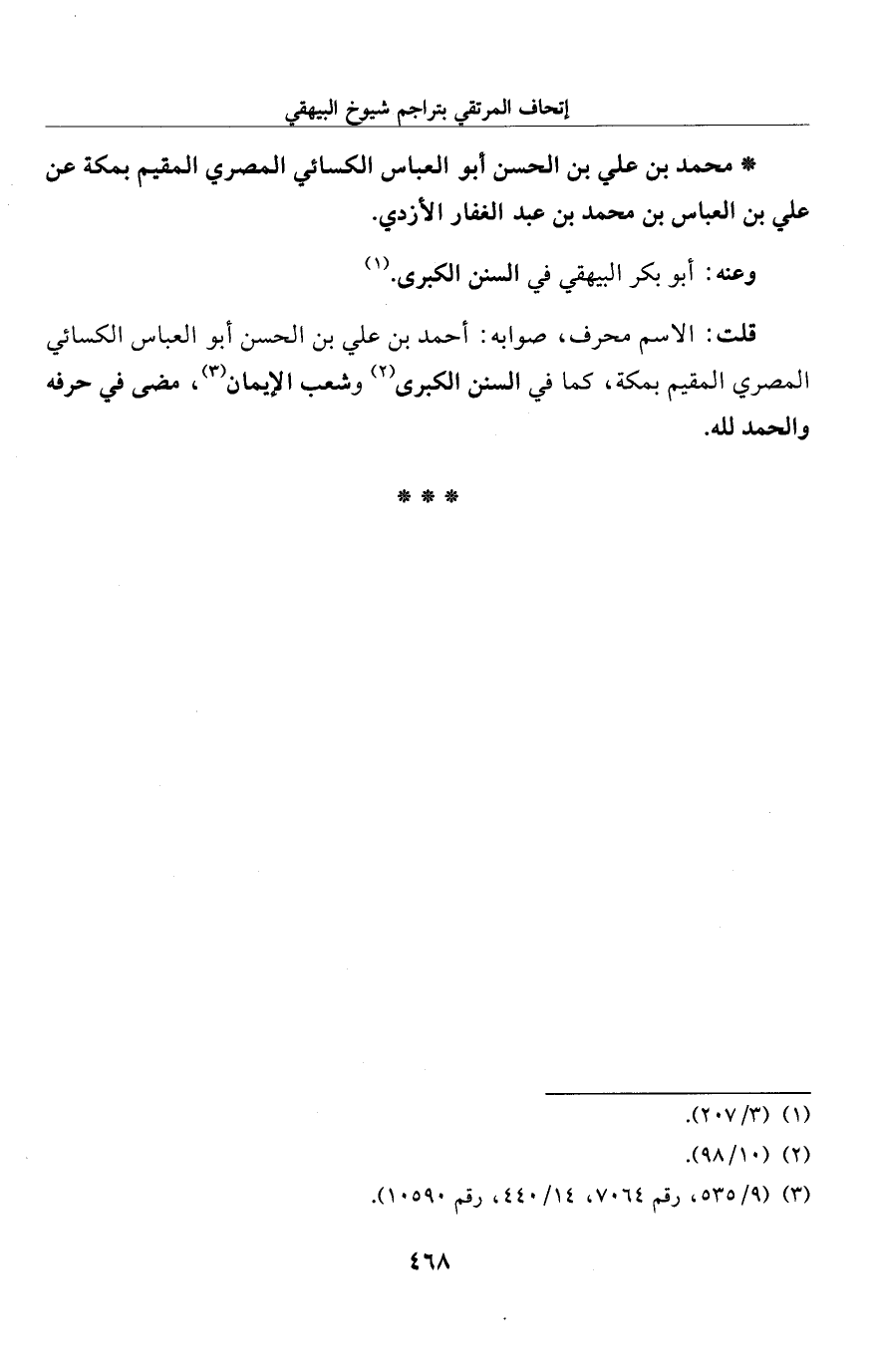 قلت: الاسم محرف، صوابه: أحمد بن علي بن الحسن أبو العباس الكسائي المصري المقيم بمكة، كما في السنن الكبرى (¬2) وشعب الإيمان (¬3)، مضى في حرفه والحمد لله.