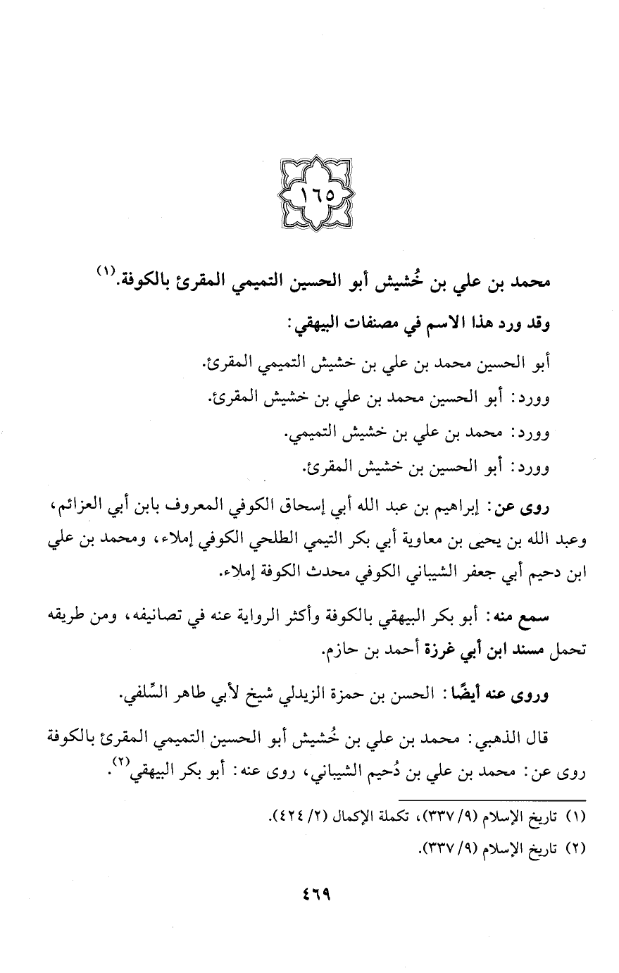 قال الذهبي: محمَّد بن علي بن خُشيش أبو الحسين التميمي المقرئ بالكوفة روى عن: محمَّد بن علي بن دُحيم الشيباني، روى عنه: أبو بكر البيهقي (¬2).