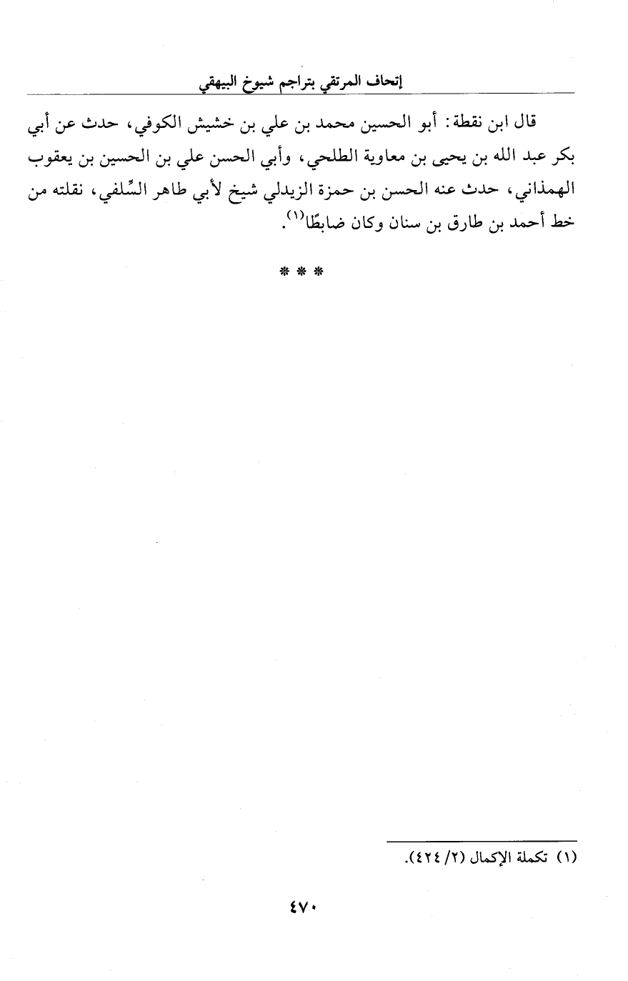 قال ابن نقطة: أبو الحسين محمَّد بن علي بن خشيش الكوفي، حدث عن أبي بكر عبد الله بن يحيى بن معاوية الطلحي، وأبي الحسن علي بن الحسين بن يعقوب الهمذاني، حدث عنه الحسن بن حمزة الزيدلي شيخ لأبي طاهر السِّلفي، نقلته من خط أحمد بن طارق بن سنان وكان ضابطًا (¬1).
