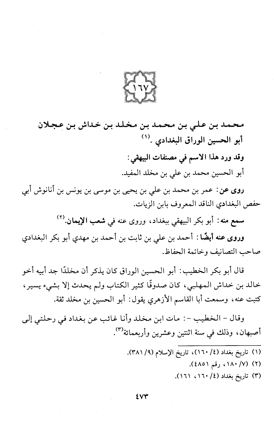 (167) محمد بن علي بن محمَّد بن مخلد بن خداش بن عجلان أبو الحسين الوراق البغدادي. (¬1)
