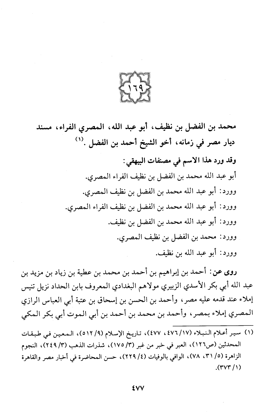 (169) محمَّد بن الفضل بن نظيف، أبو عبد الله، المصري الفراء، مسند ديار مصر في زمانه، أخو الشيخ أحمد بن الفضل. (¬1)