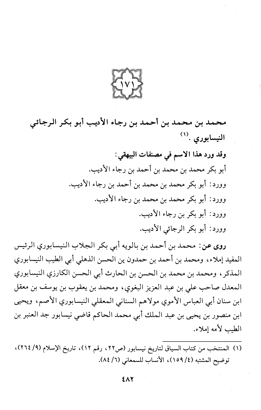 (171) محمَّد بن محمَّد بن أحمد بن رجاء الأديب أبو بكر الرجائي النيسابوري. (¬1)
