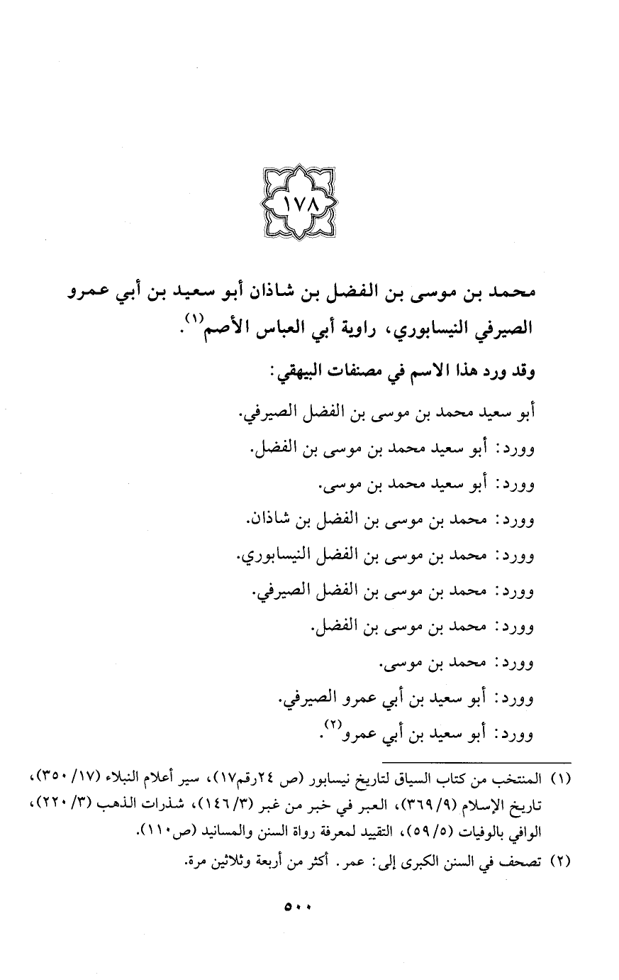 (178) محمَّد بن موسى بن الفضل بن شاذان أبو سعيد بن أبي عمرو الصيرفي النيسابوري، راوية أبي العباس الأصم (¬1).