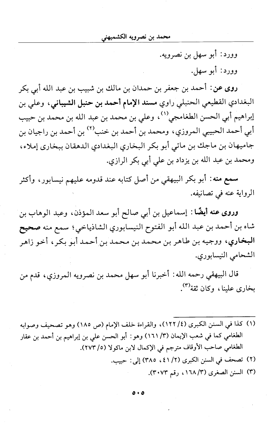 قال البيهقي رحمه الله: أخبرنا أبو سهل محمَّد بن نصرويه المروزي، قدم من بخارى علينا، وكان ثقة (¬3).