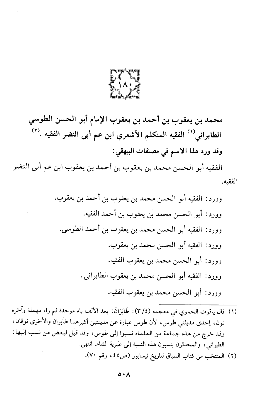 (180) محمَّد بن يعقوب بن أحمد بن يعقوب الإِمام أبو الحسن الطوسي الطابراني (¬1) الفقيه المتكلم الأشعري ابن عم أبى النضر الفقيه. (¬2)