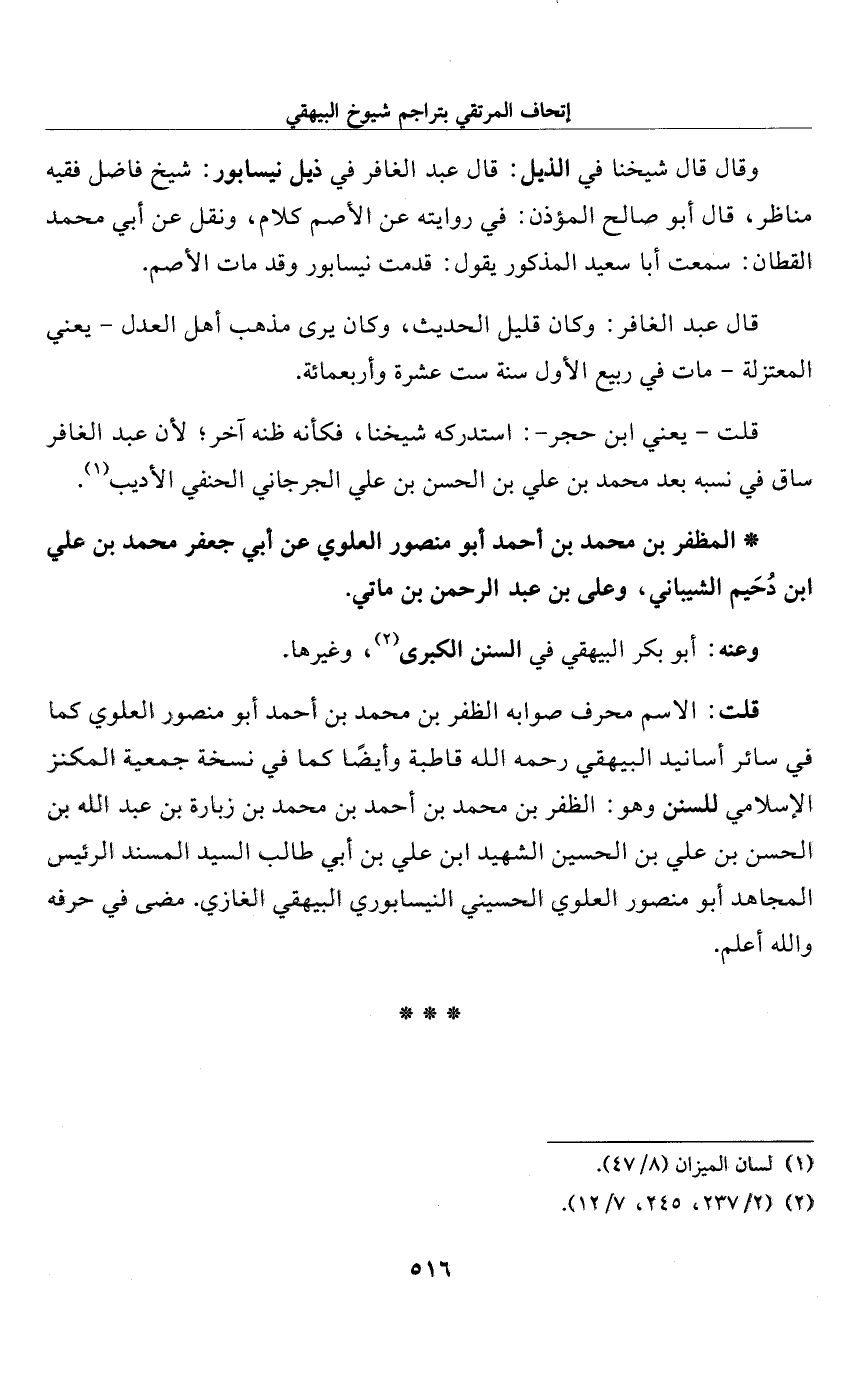 قلت: الاسم محرف صوابه الظفر بن محمَّد بن أحمد أبو منصور العلوي كما في سائر أسانيد البيهقي رحمه الله قاطبة وأيضًا كما في نسخة جمعية المكنز الإِسلامي للسنن وهو: الظفر بن محمَّد بن أحمد بن محمَّد بن زبارة بن عبد الله بن الحسن بن علي بن الحسين الشهيد ابن علي بن أبي طالب السيد المسند الرئيس المجاهد أبو منصور العلوي الحسيني النيسابوري البيهقي المغازي. مضى في حرفه والله أعلم.