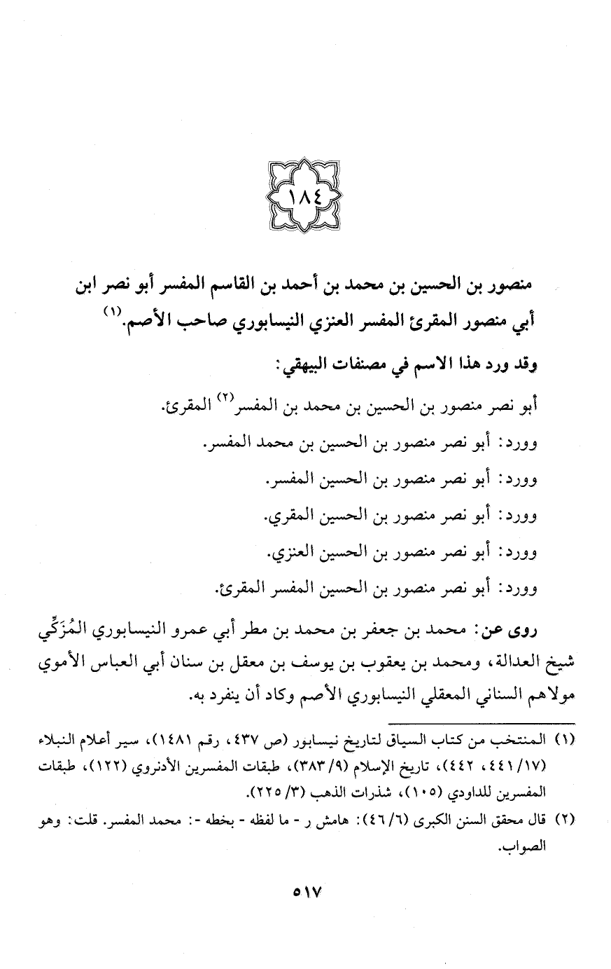 (184) منصور بن الحسين بن محمَّد بن أحمد بن القاسم المفسر أبو نصر ابن أبي منصور المقرئ المفسر العنزي النيسابوري صاحب الأصم. (¬1)