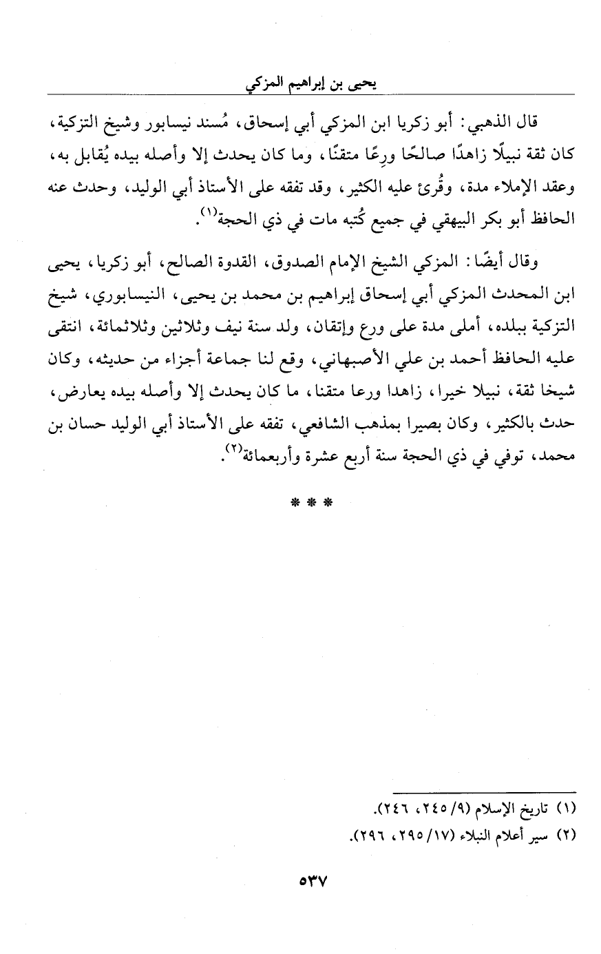 وقال أيضًا: المزكي الشيخ الإِمام الصدوق، القدوة الصالح، أبو زكريا، يحيى ابن المحدث المزكي أبي إسحاق إبراهيم بن محمَّد بن يحيى، النيسابوري، شيخ التزكية ببلده، أملى مدة على ورع وإتقان، ولد سنة نيف وثلاثين وثلاثمائة، انتقى عليه الحافظ أحمد بن علي الأصبهاني، وقع لنا جماعة أجزاء من حديثه، وكان شيخا ثقة، نبيلا خيرا، زاهدا ورعا متقنا، ما كان يحدث إلا وأصله بيده يعارض، حدث بالكثير، وكان بصيرا بمذهب الشافعي، تفقه على الأستاذ أبي الوليد حسان بن محمَّد، توفي في ذي الحجة سنة أربع عشرة وأربعمائة (¬2).