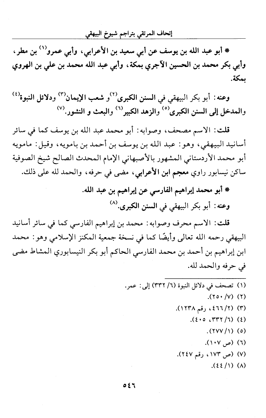 قلت: الاسم محرف وصوابه: محمَّد بن إبراهيم الفارسي كما في سائر أسانيد البيهقي رحمه الله تعالى وأيضًا كما في نسخة جمعية المكنز الإِسلامي وهو: محمَّد ابن إبراهيم بن أحمد بن محمَّد الفارسي الحاكم أبو بكر النيسابوري المشاط مضى في حرفه والحمد لله.