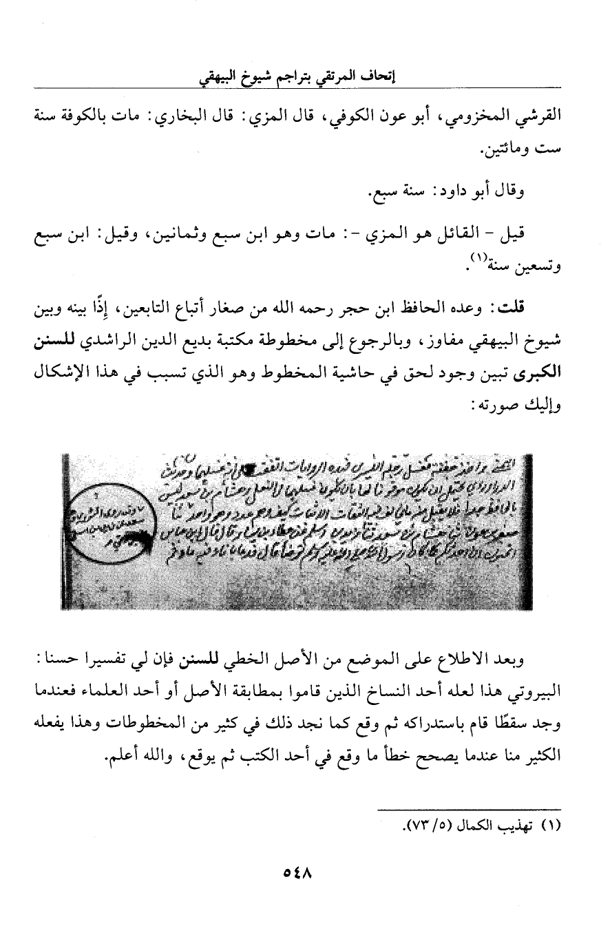 قلت: وعده الحافظ ابن حجر رحمه الله من صغار أتباع التابعين، إِذًا بينه وبين شيوخ البيهقي مفاوز، وبالرجوع إلى مخطوطة مكتبة بديع الدين الراشدي للسنن الكبرى تبين وجود لحق في حاشية المخطوط وهو الذي تسبب في هذا الإشكال وإليك صورته: