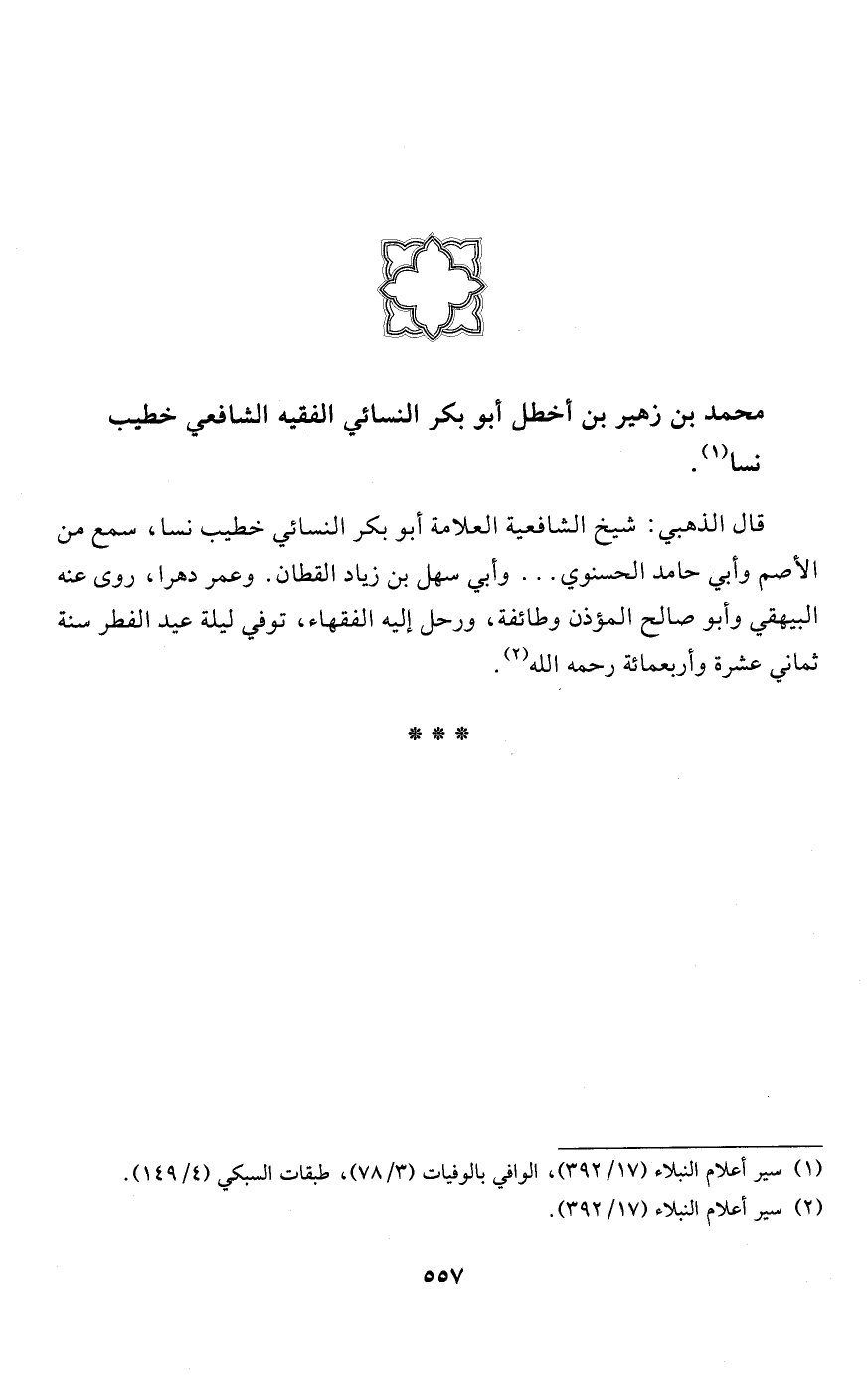 قال الذهبي: شيخ الشافعية العلامة أبو بكر النسائي خطيب نسا، سمع من الأصم وأبي حامد الحسنوي ... وأبي سهل بن زياد القطان. وعمر دهرا، روى عنه البيهقي وأبو صالح المؤذن وطائفة، ورحل إليه الفقهاء، توفي ليلة عيد الفطر سنة ثماني عشرة وأربعمائة رحمه الله (¬2).