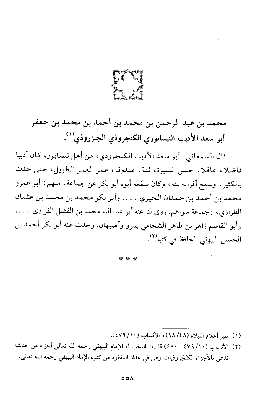 (¬2) الأنساب (10/ 479، 480) قلت: انتخب له الإِمام البيهقي رحمه الله تعالى أجزاء من حديثيه تدعى بالأجزاء الكَنْجَروذيات وهي في عداد المفقود من كتب الإِمام البيهقي رحمه الله تعالى.