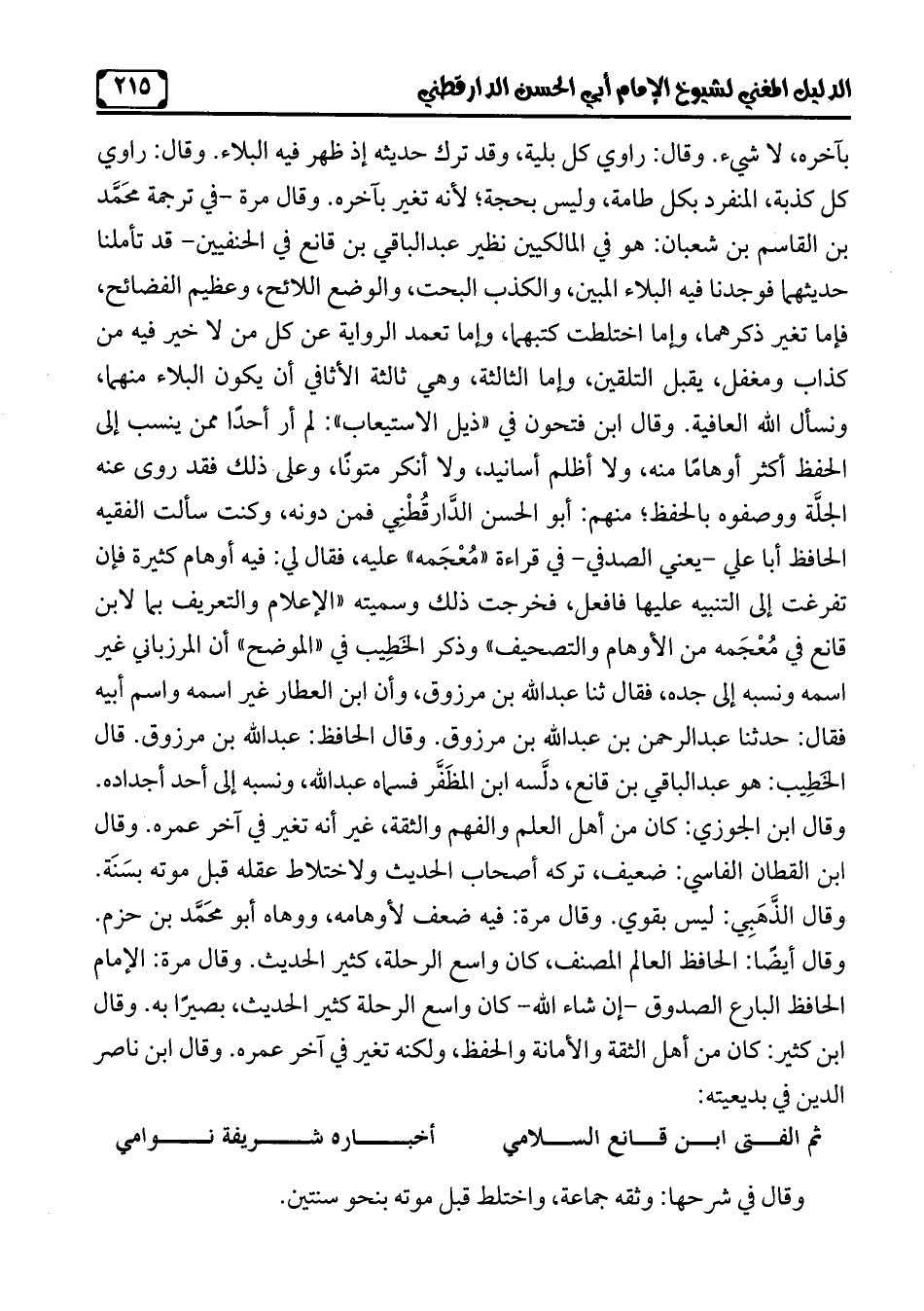 بآخره، لا شيءٍ. وقال: راوي كل بلية، وقد ترك حديثه إذ ظهر فيه البلاء. وقال: راوي كلّ كذبة، المنفرد بكل طامة، وليس بحجة؛ لأنّه تغير بآخره. وقال مرّة -في ترجمة محَمَّد بن القاسم بن شعبان: هو في المالكين نظير عبد الباقي بن قانع في الحنفيين- قد تأملنا حديثهما فوجدنا فيه البلاء المبين، والكذب البحت، والوضع اللائح، وعظيم الفضائح، فإما تغير ذكرهما، وإما اختلطت كتبهما، وإما تعمد الرِّواية عن كلّ من لا خير فيه من كذاب ومغفل، يقبل التلقين، وإما الثّالثة، وهي ثالثة الأثافي أنّ يكون البلاء منهما، ونسأل الله العافية. وقال ابن فتحون في "ذيل الاستيعاب": لم أر أحدًا ممّن ينسب إلى الحفظ أكثر أوهامًا منه، ولا أظلم أسانيد، ولا أنكر متونًا، وعلى ذلك فقد روى عنه الجلَّة ووصفوه بالحفظ؛ منهم: أبو الحسن الدَّارقُطْنِي فمن دونه، وكنت سألت الفقيه الحافظ أبا علي -يعني الصدفي- في قراءة "مُعْجَمه" عليه، فقال لي: فيه أوهام كثيرة فإن تفرغت إلى التنبيه عليها فافعل، فخرجت ذلك وسميته "الإعلام والتعريف بما لابن قانع في مُعْجَمه من الأوهام والتصحيف" وذكر الخَطِيب في "الموضح" أنّ المرزباني غير اسمه ونسبه إلى جده، فقال ثنا عبد الله بن مرزوق، وأن ابن العطار غير اسمه واسم أبيه فقال: حدّثنا عبد الرّحمن بن عبد الله بن مرزوق. وقال الحافظ: عبد الله بن مرزوق. قال الخَطِيب: هو عبد الباقي بن قانع، دلَّسه ابن المظَفَّر فسماه عبد الله، ونسبه إلى أحد أجداده. وقال ابن الجوزي: كان من أهل العلم والفهم والثقة، غير أنّه تغير في آخر عمره. وقال ابن القطان الفاسي: ضعيف، تركه أصحاب الحديث ولاختلاط عقله قبل موته بسَنَة. وقال الذَّهَبِي: ليس بقوي. وقال مرّة: فيه ضعف لأوهامه، ووهاه أبو محَمَّد بن حزم. وقال أيضًا: الحافظ العالم المصنف، كان واسع الرحلة، كثير الحديث. وقال مرّة: الإمام الحافظ البارع الصدوق -إن شاء الله- كان واسع الرحلة كثير الحديث، بصيرًا به. وقال ابن كثير: كان من أهل الثقة والأمانة والحفظ، ولكنه تغير في آخر عمره. وقال ابن ناصر الدِّين في بديعيته: