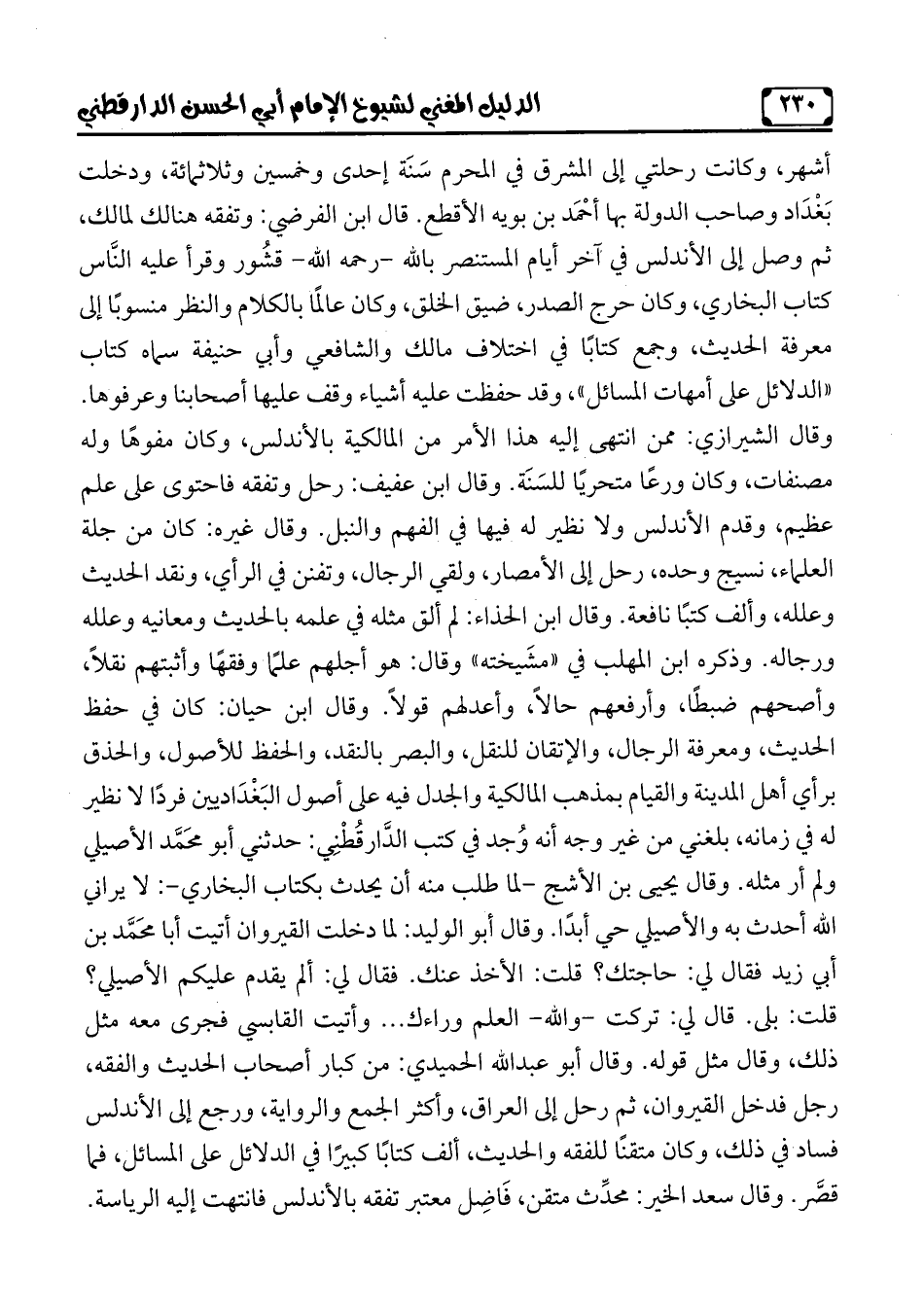 أشهر، وكانت رحلتي إلى المشرق في المحرم سَنَة إحدى وخمسين وثلاثمائة، ودخلت بَغْدَاد وصاحب الدولة بها أحْمَد بن بويه الأقطع. قال ابن الفرضي: وتفقه هنالك لمالك، ثمّ وصل إلى الأندلس في آخر أيّام المستنصر بالله - رحمه الله - قشُور وقرأ عليه النَّاس كتاب البخاريّ، وكان حرج الصدر، ضيق الخلق، وكان عالمًا بالكلام والنظر منسوبًا إلى معرفة الحديث، وجمع كتابًا في اختلاف مالك والشّافعيّ وأبي حنيفة سماه كتاب "الدلائل على أمهات المسائل"، وقد حفظت عليه أشياء وقف عليها أصحابنا وعرفوها. وقال الشيرازي: ممّن انتهى إليه هذا الأمر من المالكية بالأندلس، وكان مفوهًا وله مصنفات، وكان ورعًا متحريًا للسَنَة. وقال ابن عفيف: رحل وتفقه فاحتوى على علم عظيم، وقدم الأندلس ولا نظير له فيها في الفهم والنبل. وقال غيره: كان من جلة العلماء، نسيج وحده، رحل إلى الأمصار، ولقي الرجال، وتفنن في الرأي، ونقد الحديث وعلله، وألف كتبًا نافعة. وقال ابن الحذاء: لم ألق مثله في علمه بالحديث ومعانيه وعلله ورجاله. وذكره ابن المهلب في "مشَيخته" وقال: هو أجلهم علمًا وفقهًا وأثبتهم نقلًا، وأصحهم ضبطًا، وأرفعهم حالًا، وأعدلهم قولًا. وقال ابن حيان: كان في حفظ الحديث، ومعرفة الرجال، والإتقان للنقل، والبصر بالنقد، والحفظ للأصول، والحذق برأي أهل المدينة والقيام بمذهب المالكية والجدل فيه على أصول البَغْدَاديين فردًا لا نظير له في زمانه، بلغني من غير وجه أنّه وُجد في كتب الدَّارقُطْنِي: حدثني أبو محَمَّد الأصيلي ولم أر مثله. وقال يحيى بن الأشج- لما طلب منه أنّ يحدث بكتاب البخاريّ-: لا يراني الله أحدث به والأصيلي حي أبدًا. وقال أبو الوليد: لما دخلت القيروان أتيت أبا محَمَّد بن أبي زيد فقال لي: حاجتك؟ قلت: الأخذ عنك. فقال لي: ألم يقدم عليكم الأصيلي؟ قلت: بلى. قال لي: تركت- والله- العلم وراءك ... وأتيت القابسي فجرى معه مثل ذلك، وقال مثل قوله. وقال أبو عبد الله الحميدي: من كبار أصحاب الحديث والفقه، رجل فدخل القيروان، ثمّ رحل إلى العراق، وأكثر الجمع والرواية, ورجع إلى الأندلس فساد في ذلك، وكان متقنًا للفقه والحديث، ألف كتابًا كبيرًا في في الدلائل على المسائل، فما قصَّر. وقال سعد الخير: محدِّث متقن، فَاضِل معتبر تفقه بالأندلس فانتهت إليه الرياسة.