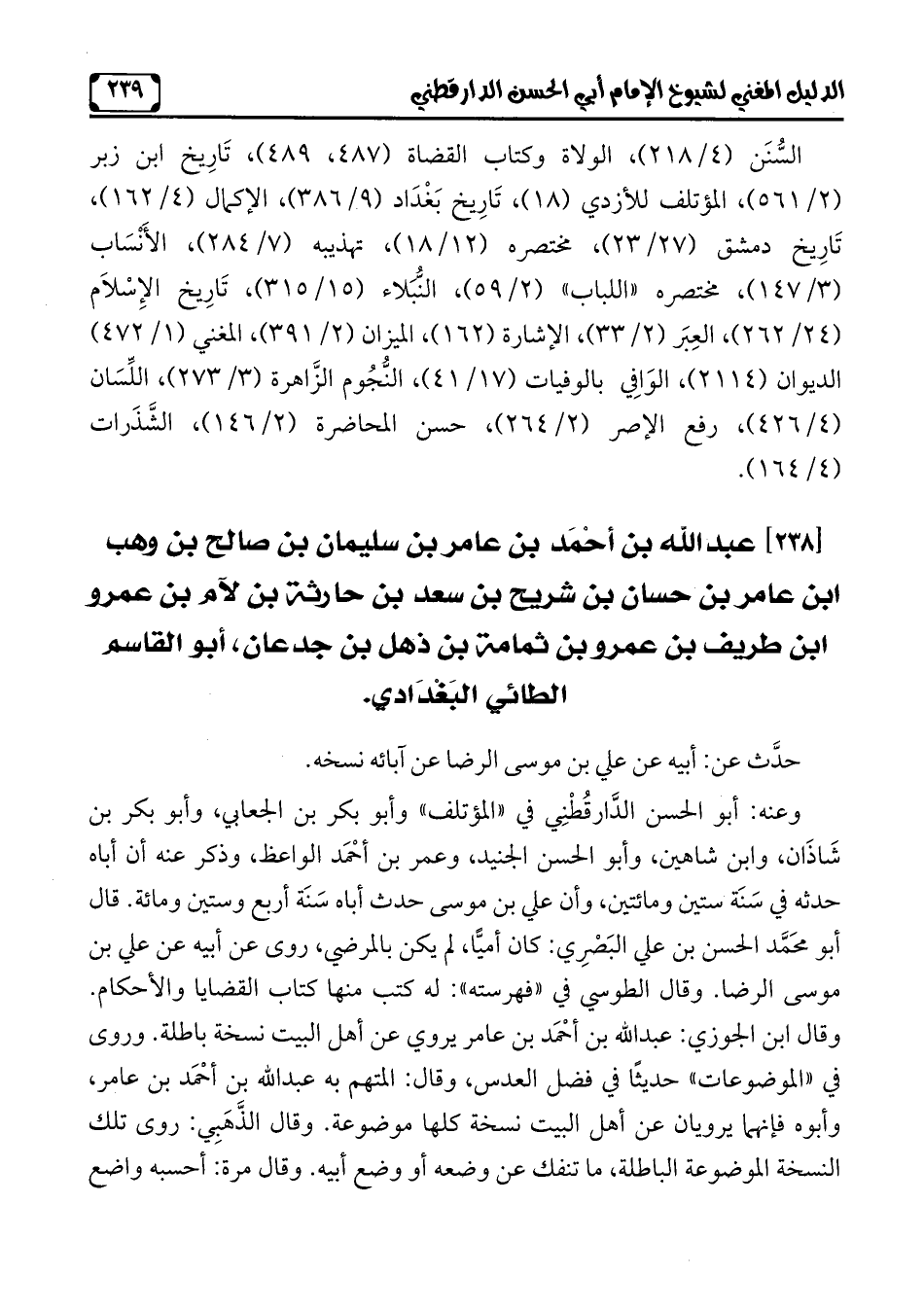 [238] عبد الله بن أحْمَد بن عامر بن سليمان بن صالح بن وهب ابن عامر بن حسان بن شريح بن سعد بن حارثة بن لآم بن عمرو ابن طريف بن عمرو بن ثمامة بن ذهل بن جدعان , أبو القاسم الطائي البَغْدَادي.