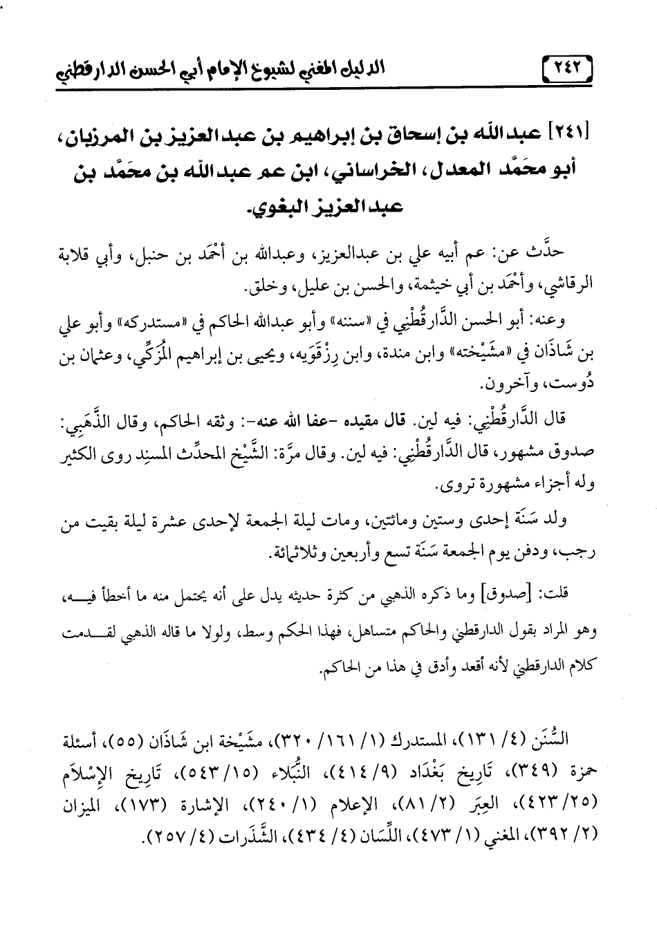 السُّنَن (4/ 131)، المستدرك (1/ 161/ 320)، مشَيْخة ابن شَاذَان (55)، أسئلة حمزة (349)، تَارِيخ بَغْدَاد (9/ 414)، النُّبَلاء (15/ 543)، تَارِيخ الإِسْلَام (25/ 423)، العِبَر (2/ 81)، 1 لإعلام (1/ 240)، الإشارة (173)، الميزان (2/ 392)، المغني (1/ 473)، اللِّسَان (4/ 434)، الشَّذَرات (4/ 257).
