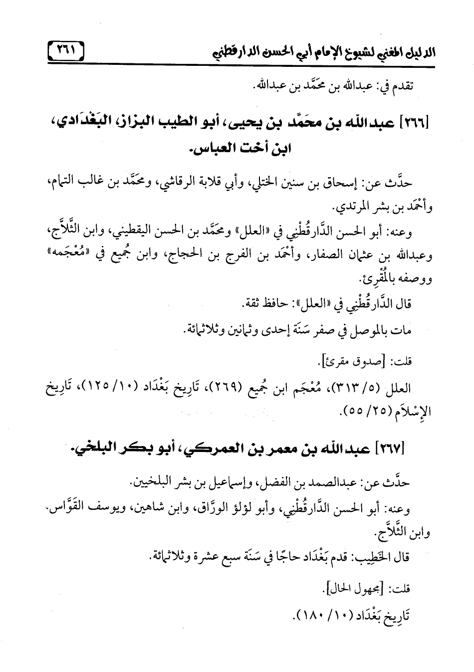 [266] عبد الله بن محَمَّد بن يحيى، ألبو الطيب البزاز، البَغْدَادي، ابن أخت العباس.