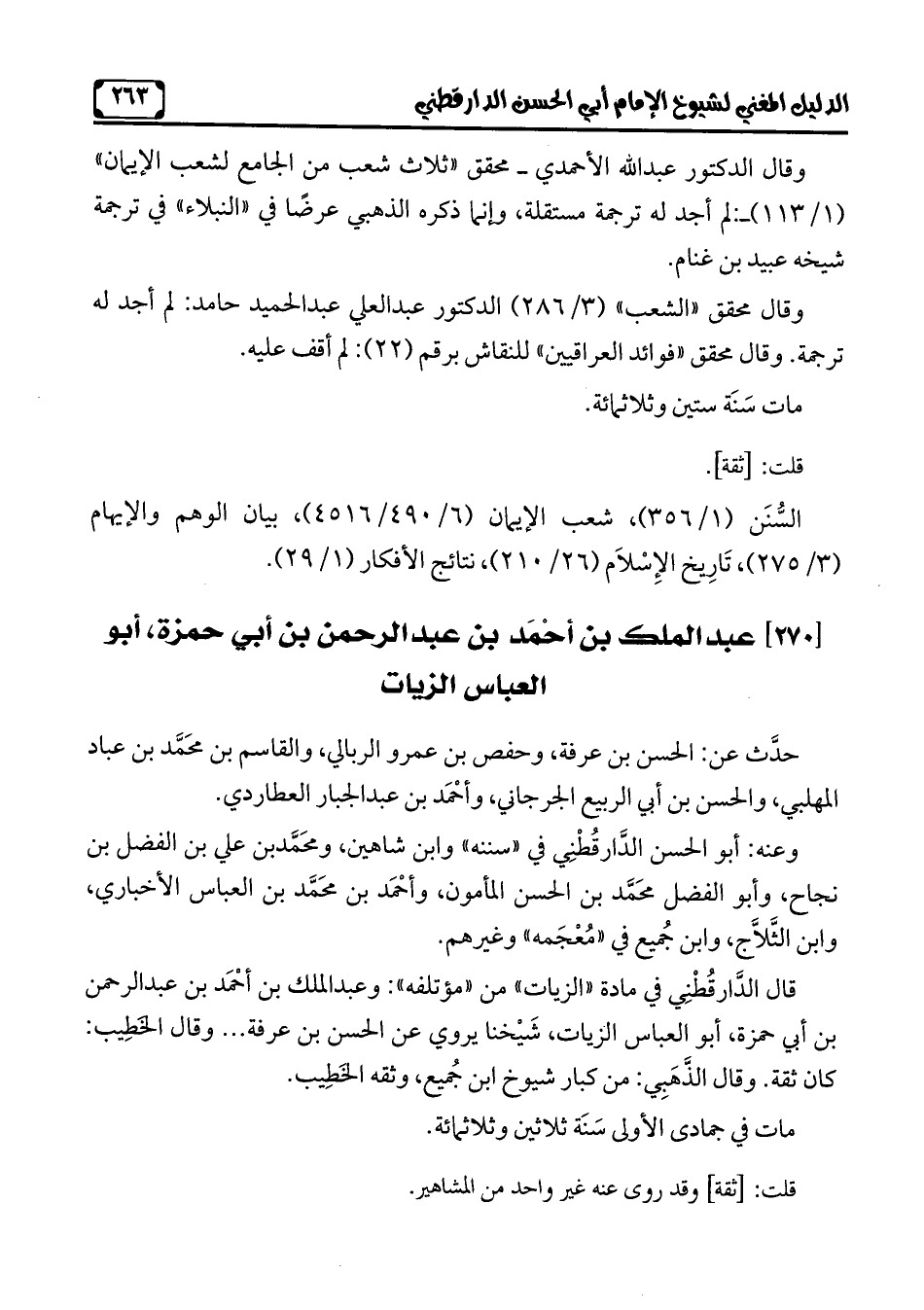 السُّنَن (1/ 356)، شعب الإيمان (6/ 490/ 4516)، بيان الوهم والإيهام (3/ 275)، تَارِيخ الإِسْلَام (26/ 210)، نتائج الأفكار (1/ 29).