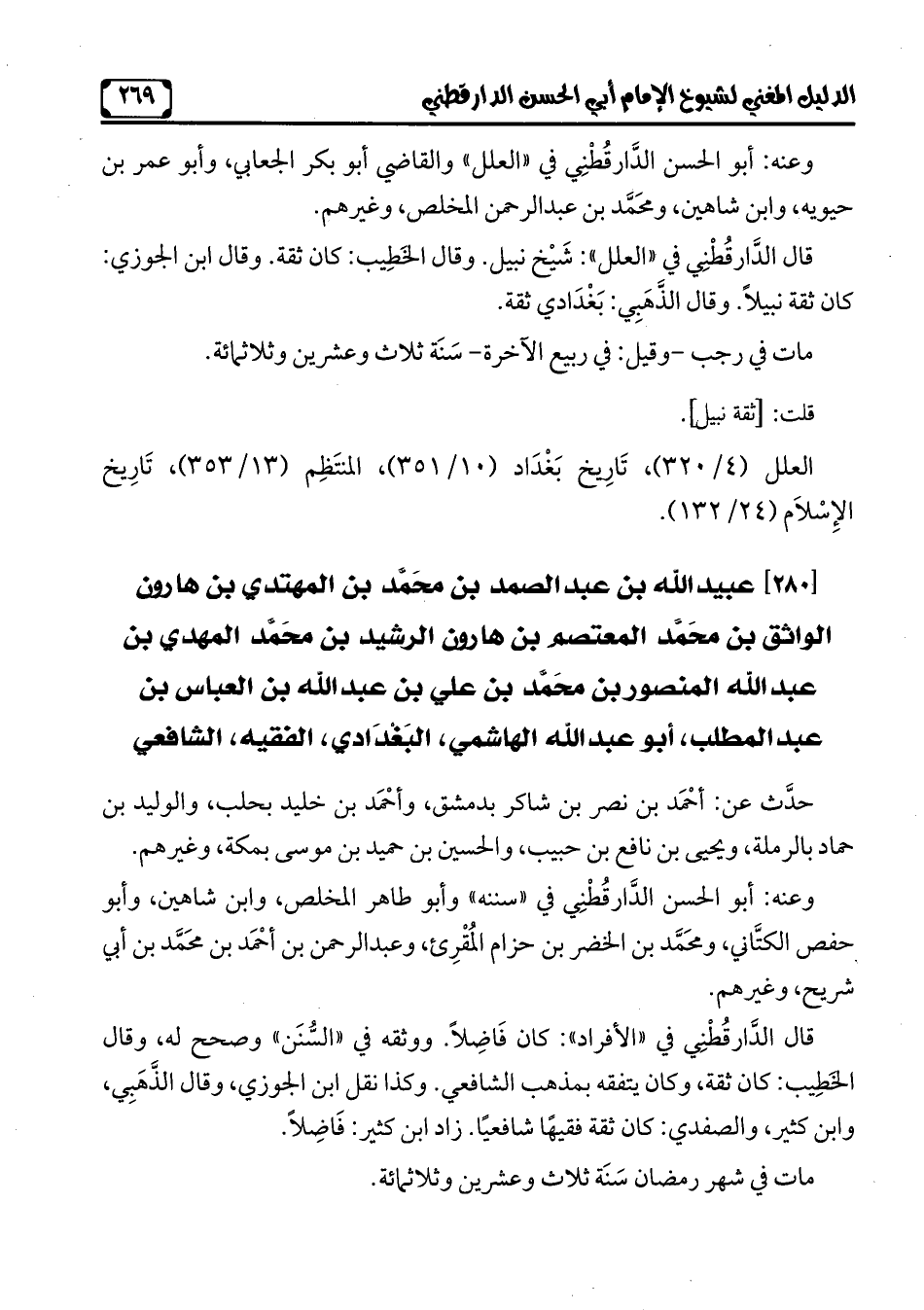 العلل (4/ 320)، تَارِيخ بَغْدَاد (10/ 351)، المنتَظِم (13/ 353)، تَارِيخ الإِسْلَام (24/ 132).