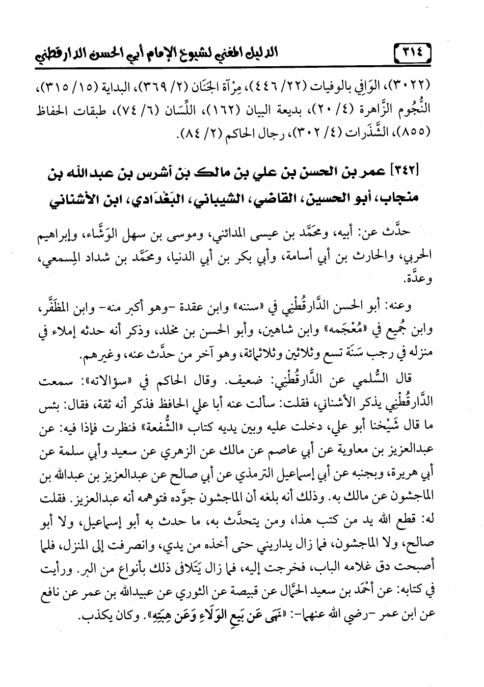 [342] عمر بن الحسن بن علي بن مالك بن أشرس بن عبد الله بن منجاب، أبو الحسين، القاضي، الشيباني، البَغْدَادي، ابن الاشناني