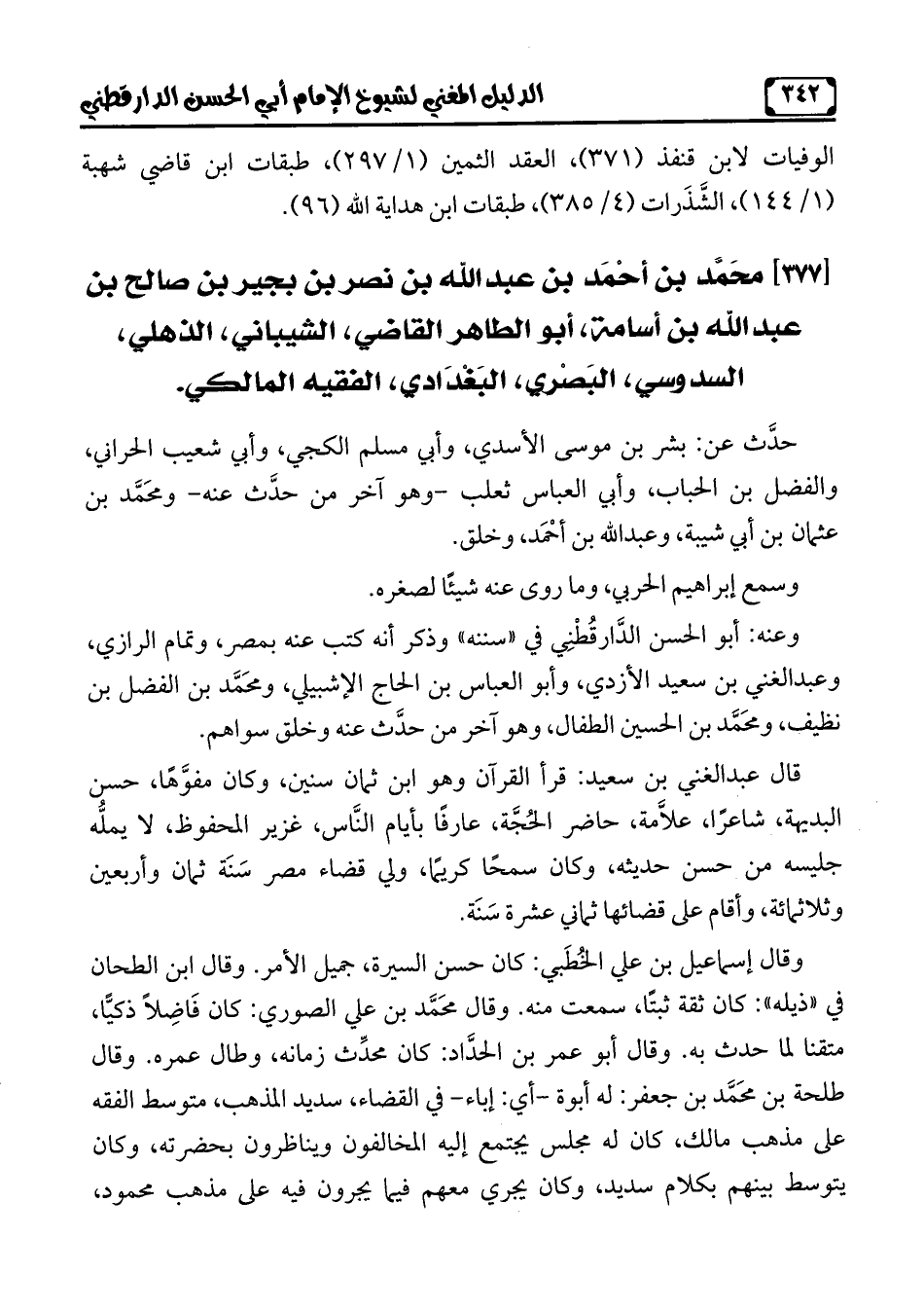 [377] محَمَّد بن أحْمَد بن عبد الله بن نصر بن بجير بن صالح بن عبد الله بن أسامة، أبو الطّاهر القاضي، الشيباني، الذهلي، السدوسي، البَصْري، البَغْدَادي، الفقيه المالكي.