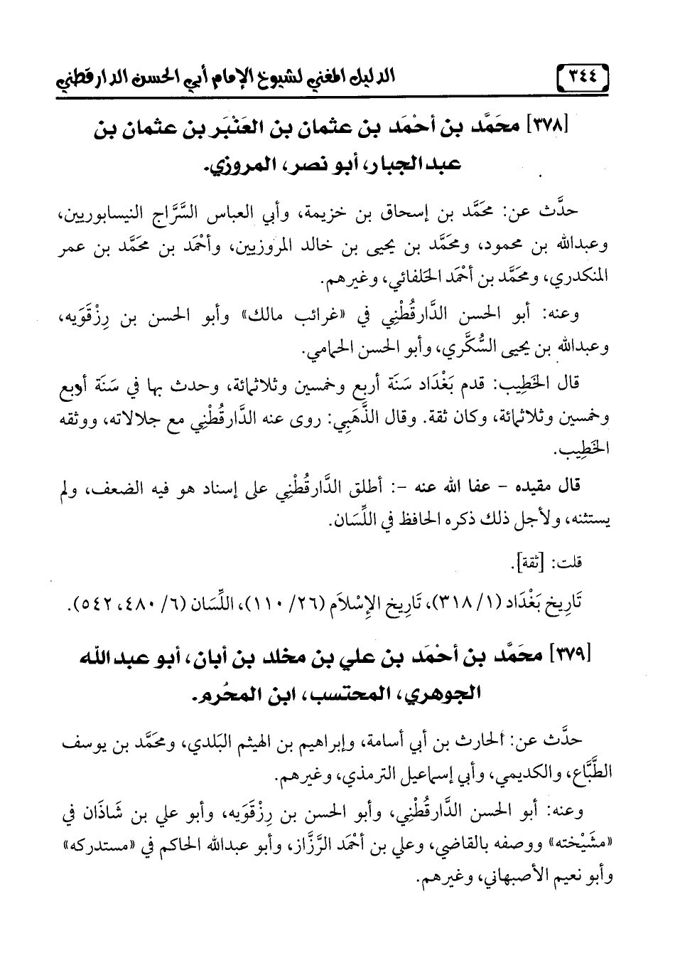 تَارِيخ بَغْدَاد (1/ 318)، تَارِيخ الإِسْلَام (26/ 110)، اللِّسَان (6/ 480، 542).