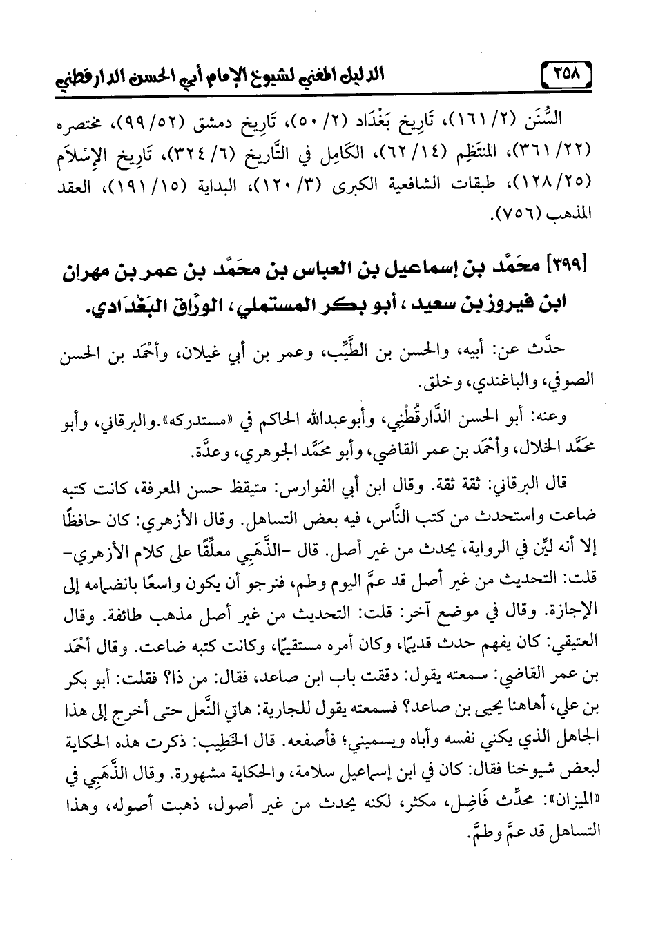 [399] محَمَّد بن إسماعيل بن العباس بن محَمَّد بن عمر بن مهران ابن فيروز بن سعيد، أبو بكر المستملي، الورَّاق البَغْدَادي.