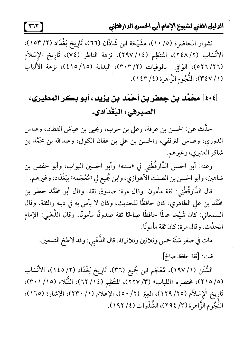 [404] محَمَّد بن جعفر بن أحْمَد بن يزيد، أبو بكر المطيري، الصيرفي، البَغْدَادي.