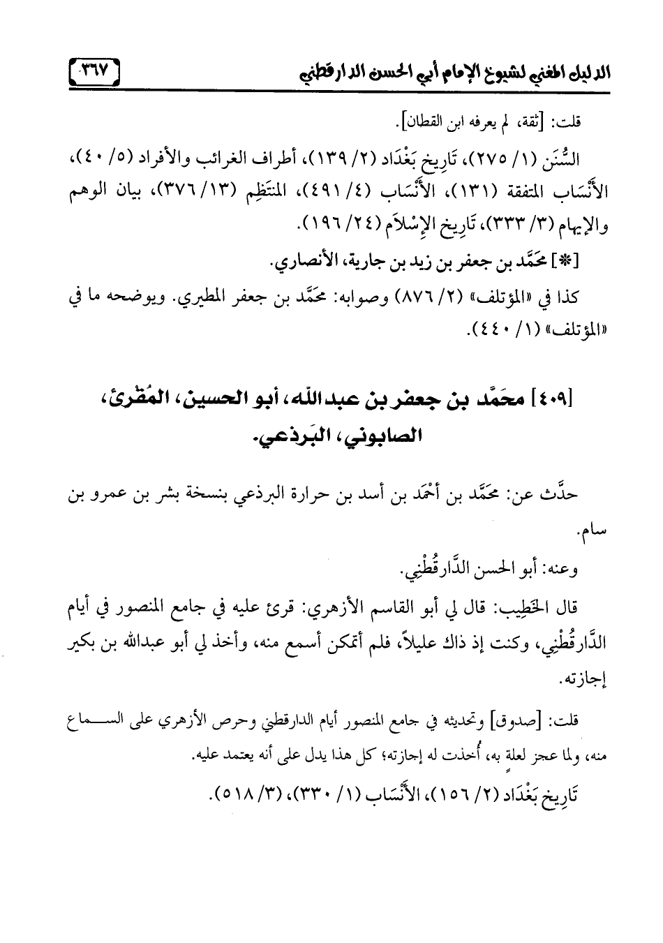 قلت: [صدوق] وتحديثه في جامع المنصور أيّام الدارقطني وحرص الأزهري على السماع منه، ولما عجز لعلّةٍ به، أُخذت له إجازته؛ كلّ هذا يدلُّ على أنّه يعتمد عليه.