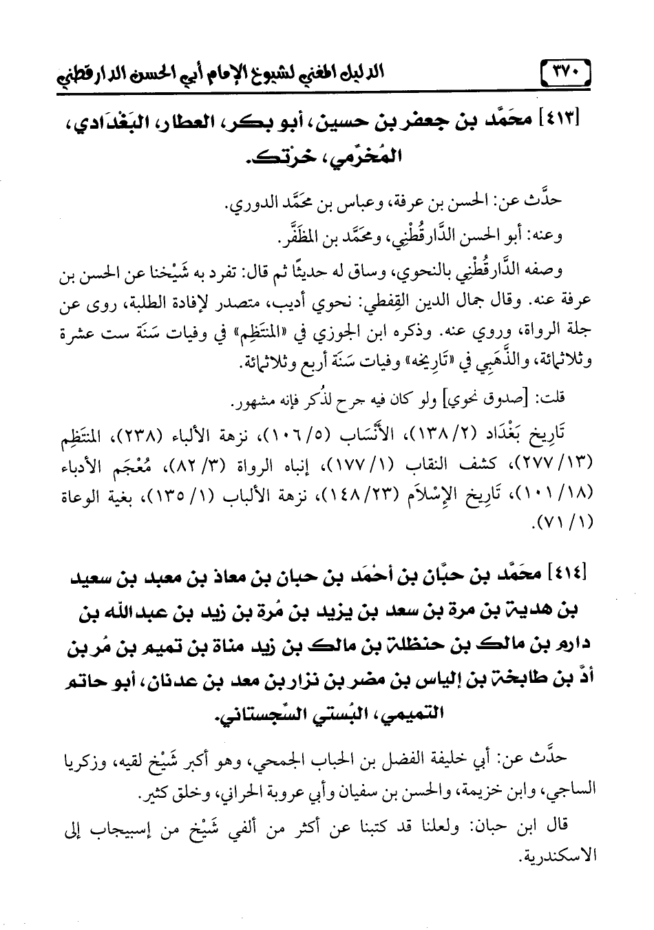 [414] محَمَد بن حبَّان بن أحْمَد بن حبّان بن معاذ بن معبد بن سعيد بن هدية بن مرّة بن سعد بن يزيد بن مُرة بن زيد بن عبد الله بن دارم بن مالك بن حنظلة بن مالك بن زيد مناة بن تميم بن مُر بن أدّ بن طابخة بن إلياس بن مضر بن نزار بن معد بن عدنان، أبو حاتم التميمي، البُستي السِّجستاني.