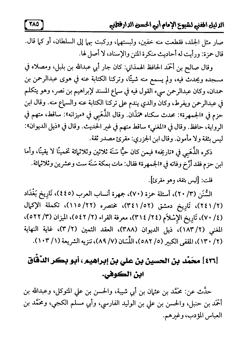 السُّنَن (3/ 20)، أسئلة حمزة (70)، جمهرة أنساب العرب (445)، تَارِيخ بَغْدَاد (3/ 241)، تَارِيخ دمشق (52/ 341)، مختصره (22/ 115)، تكملة الإكمال (4/ 70)، تَارِيخ الإسْلَام (24/ 314)، معرفة القراء (2/ 543)، الميزان (3/ 522)، المغني (2/ 183)، ذيل الديوان (388)، العقد الثمين (2/ 3)، غاية النهاية (2/ 130)، المقفى الكبير (5/ 582)، اللِّسَان (7/ 89)، تنزيه الشّريعة (1/ 103).