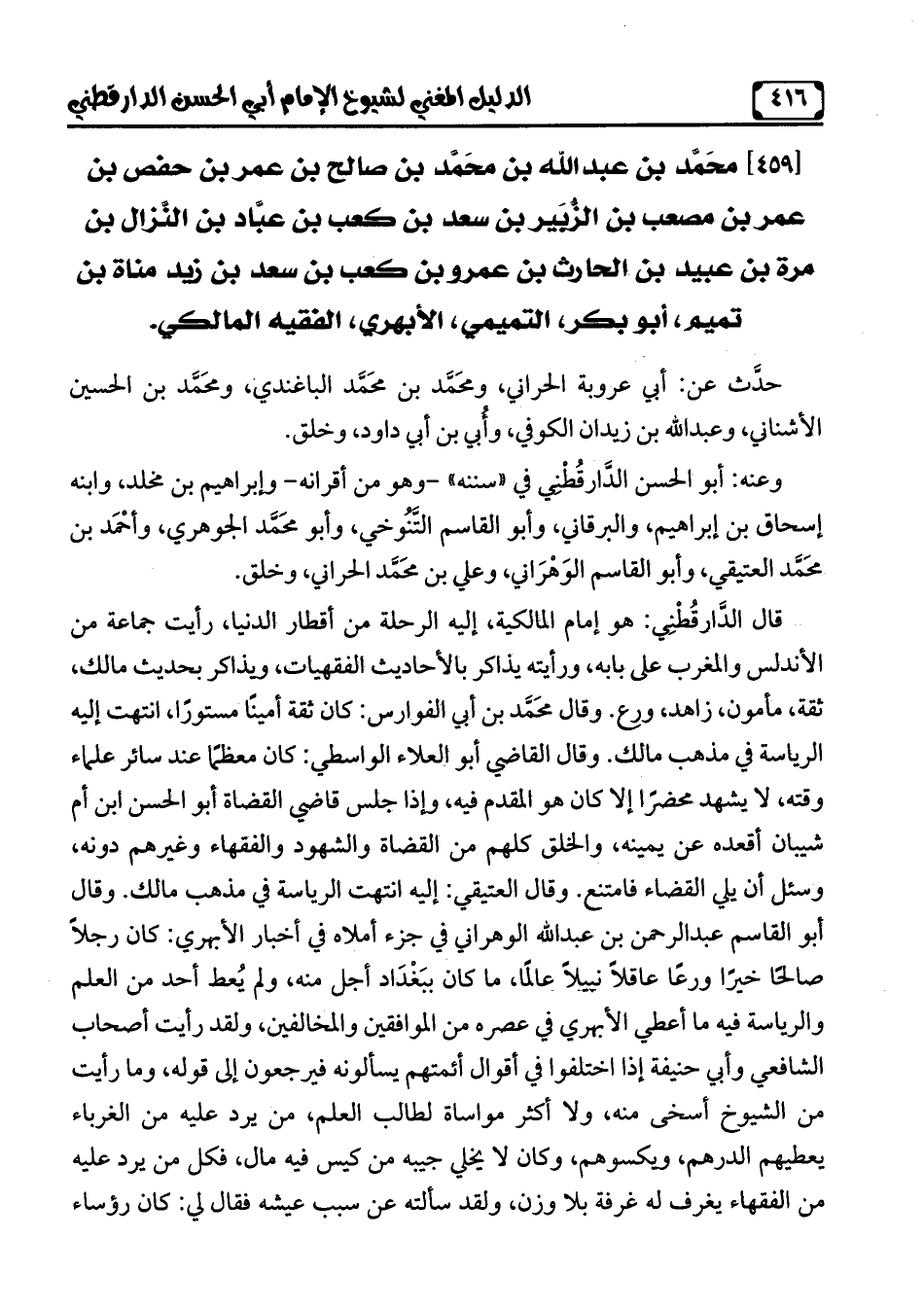 [459] محَمَّد بن عبد الله بن محَمَّد بن صالح بن عمر بن حفص بن عمر بن مُصْعَب بن الزُّبير بن سعد بن كعب بن عبَّاد بن النَّزال بن مرّة بن عبيد بن الحارث بن عمرو بن كعب بن سعد بن زيد مناة بن تميم، أبو بكر، التميمي، الأبهري، الفقيه المالكي.