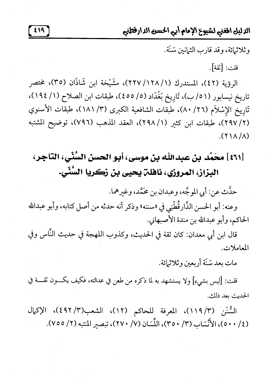 [461] محَمَّد بن عبد الله بن موسى، أبو الحسن السُّنِّي، التاجر، البزاز، المروزي، نافلة, يحيى بن زكريا السُّنِّي.