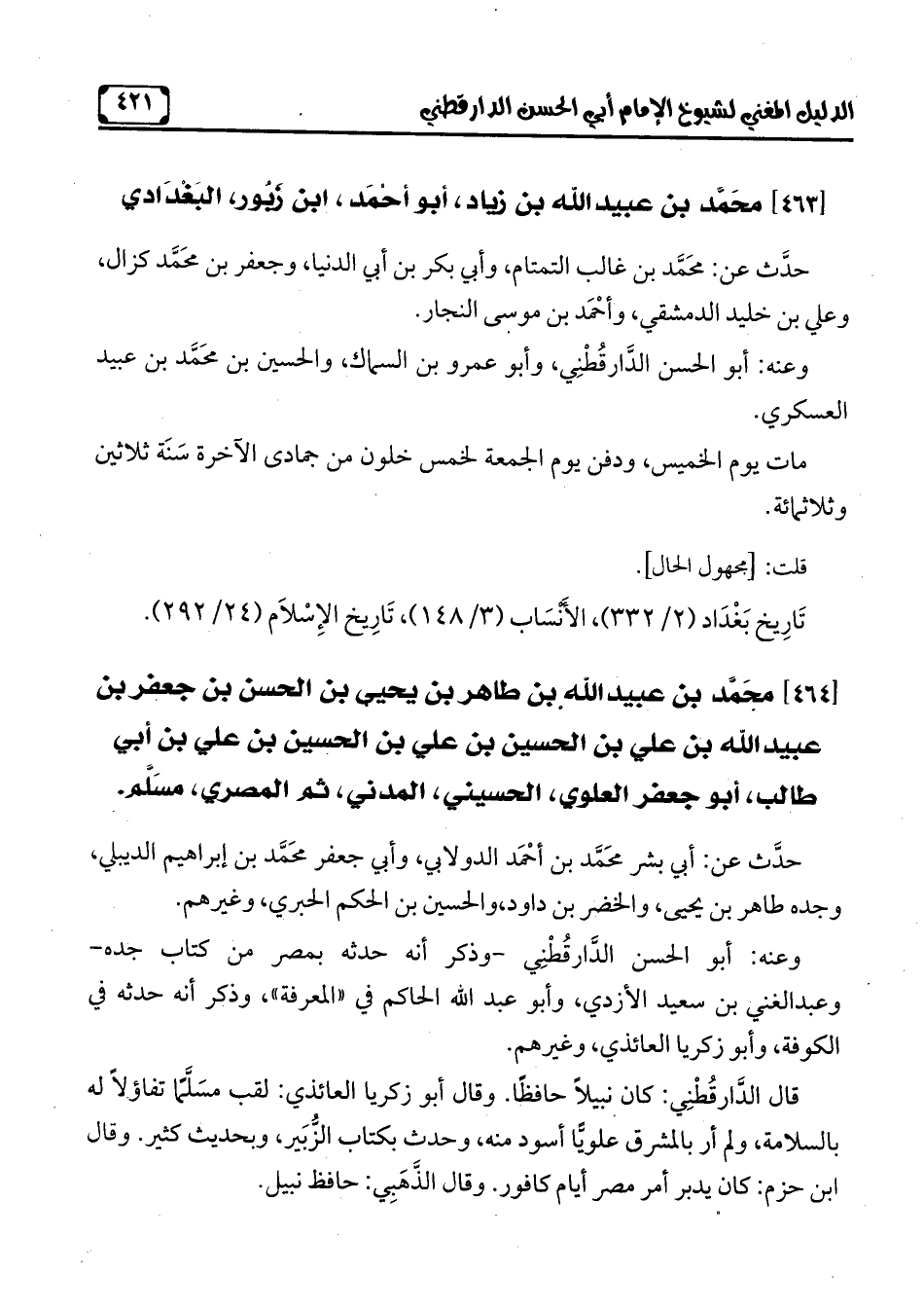 [464] مجَمَد بن عبيد الله بن طاهر بن يحيى بن الحسن بن جعفر بن عبيد الله بن على بن الحْسين بن على بن الحسين بن على بن أبي طالب، أبو جعفر العلّوي، الحسيني، المدني، ثمّ المصري، مسَلَّم.
