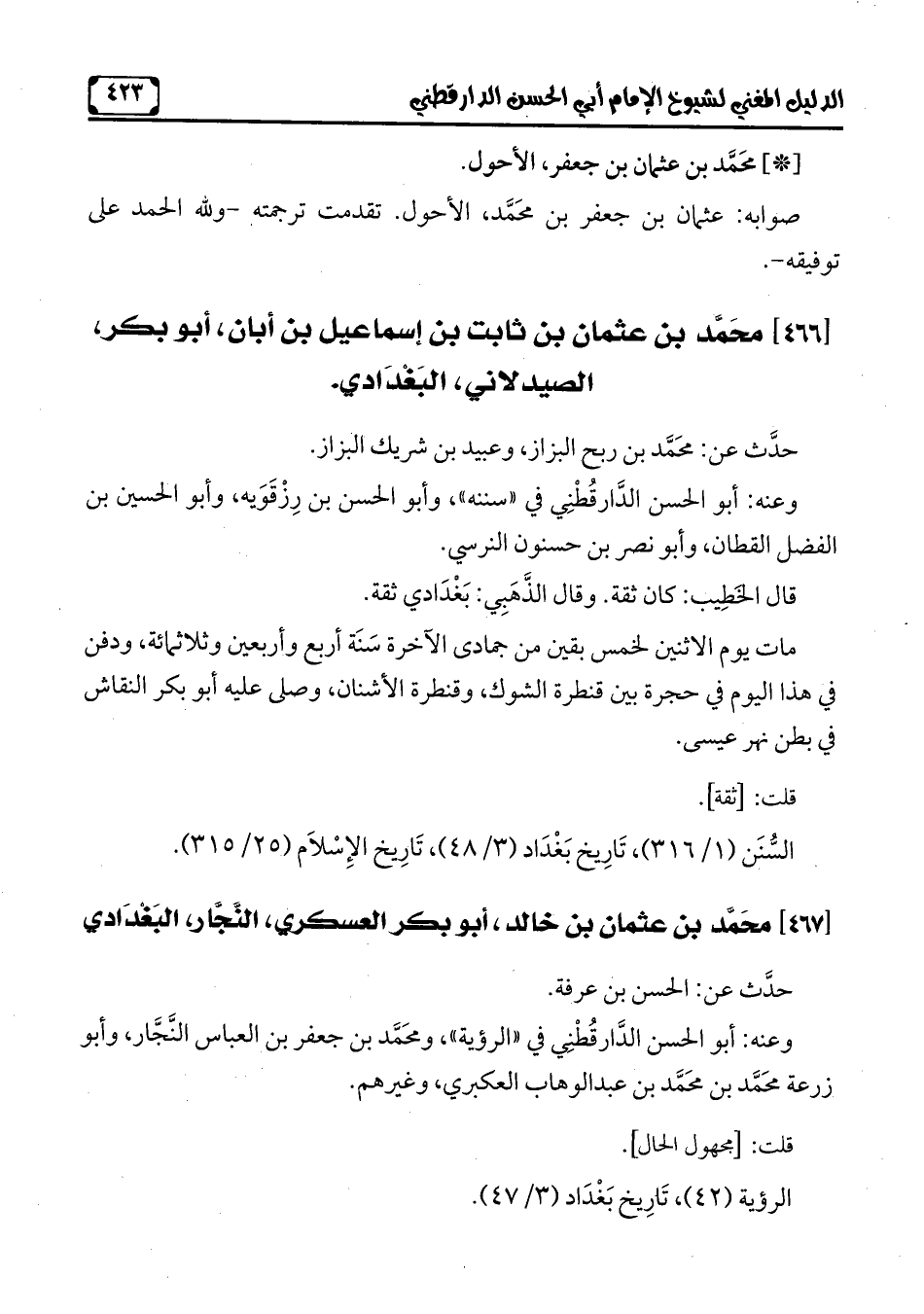 السُّنَن (1/ 316)، تَارِيخ بَغْدَاد (3/ 48)، تَارِيخ الإِسْلَام (25/ 315).