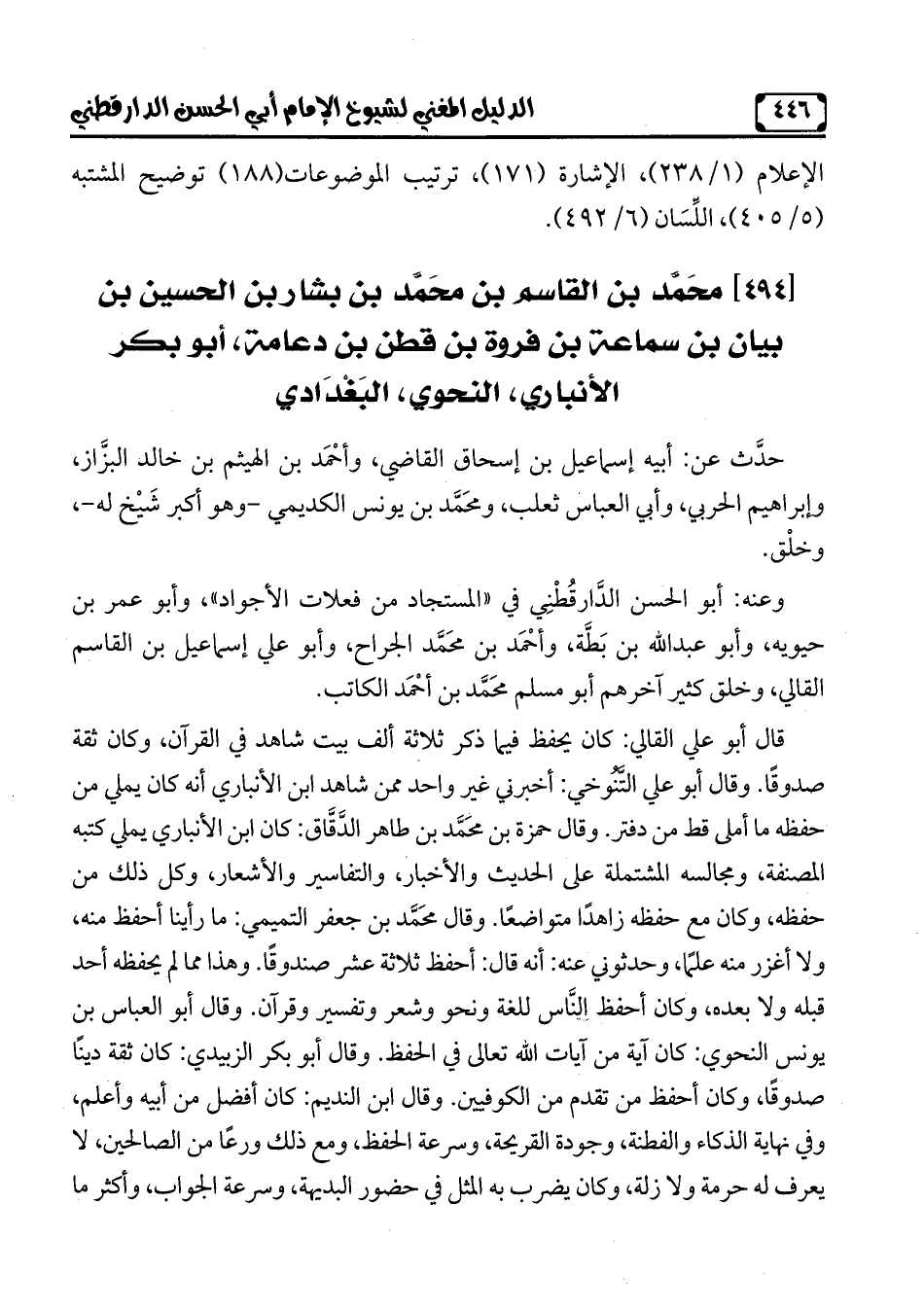 [494] محَمَّد بن القاسم بن محَمَّد بن بشار بن الحسين بن بيان بن سماعة بن فروة بن قطن بن دعامة، أبو بكر الأنباري، النحوي، البَغْدَادي