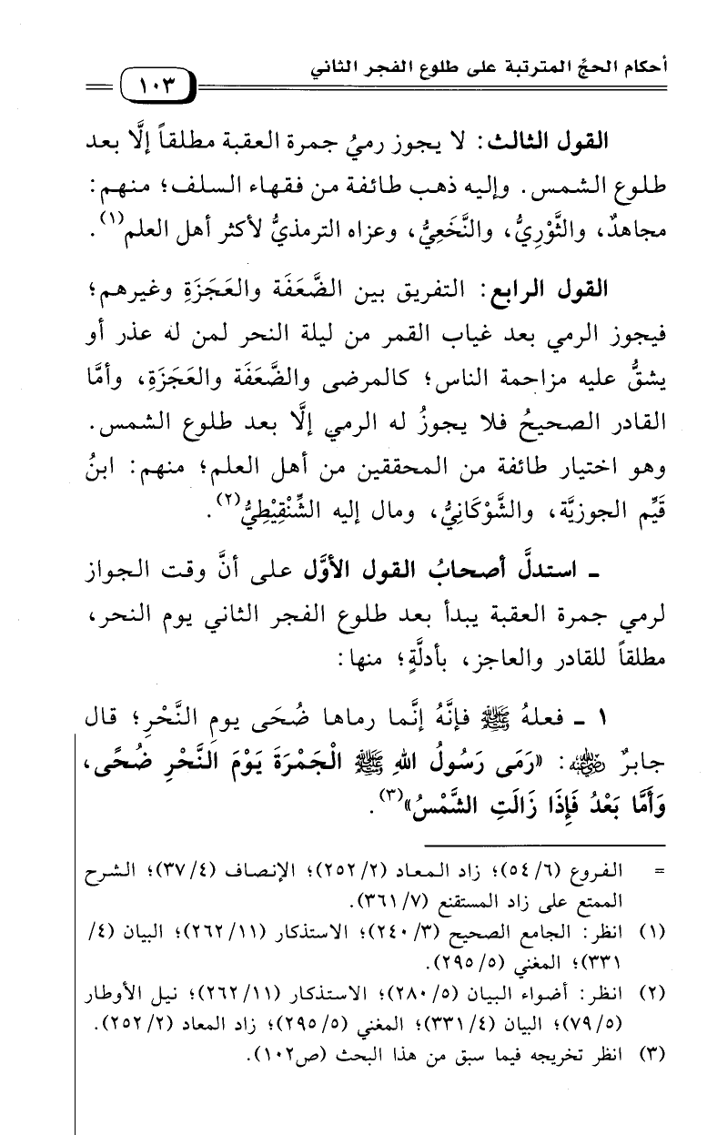 القول الرابع: التفريق بين الضعفة والعجزة وغيرهم؛ فيجوز الرمي بعد غياب القمر من ليلة النحر لمن له عذر أو يشق عليه مزاحمة الناس؛ كالمرضى والضعفة والعجزة، وأما القادر الصحيح فلا يجوز له الرمي إلا بعد طلوع الشمس. وهو اختيار طائفة من المحققين من أهل العلم؛ منهم: ابن قيم الجوزية، والشوكاني، ومال إليه الشنقيطي (¬2).