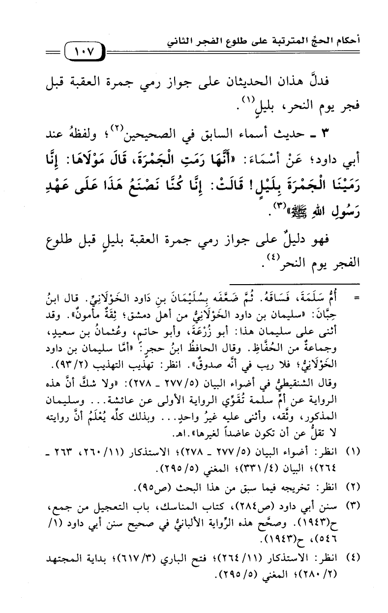 3 - حديث أسماء السابق في الصحيحين (¬2)؛ ولفظه عند أبي داود؛ عن أسماء: «أنها رمت الجمرة، قال مولاها، إنا رمينا الجمرة بليل! قالت: إنا كنا نصنع هذا على عهد رسول الله - صلى الله عليه وسلم -» (¬3).