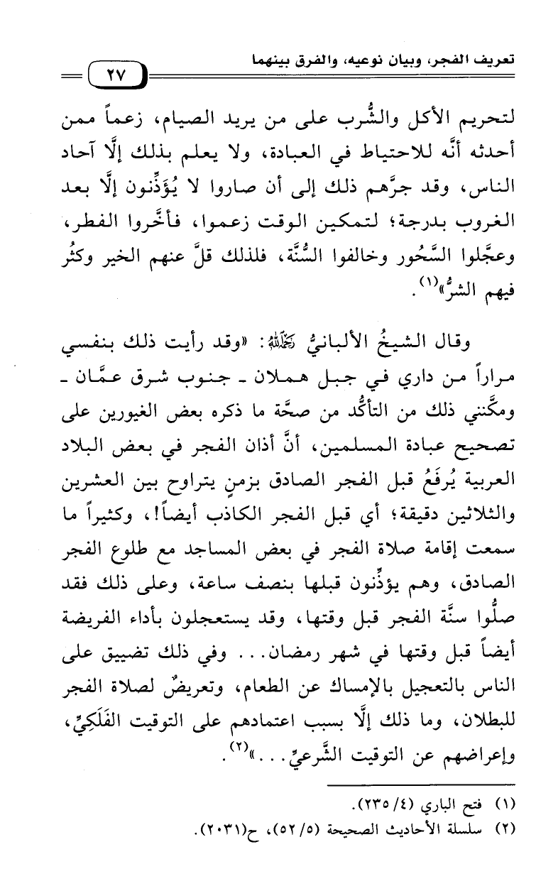 وقال الشيخ الألباني رحمه الله: "وقد رأيت ذلك بنفسي مرارًا، من داري في جبل هملان، جنوب شرق عمان، ومكنني ذلك من التأكد من صحة ما ذكره بعض الغيورين على تصحيح عبادة المسلمين، أن أذان الفجر في بعض البلاد العربية يرفع قبل الفجر الصادق بزمن يتراوح بين العشرين والثلاثين دقيقة؛ أي قبل الفجر الكاذب أيضًا! وكثيرًا ما سمعت إقامة صلاة الفجر في بعض المساجد مع طلوع الفجر الصادق، وهم يؤذنون قبلها بنصف ساعة، وعلى ذلك فقد صلوا سنة الفجر قبل وقتها، وقد يستعجلون بأداء الفريضة أيضًا قبل وقتها في شهر رمضان .. وفي ذلك تضييق على الناس بالتعجيل بالإمساك عن الطعام، وتعريض لصلاة الفجر للبطلان، وما ذلك إلا بسبب اعتمادهم على التوقيت الفلكي، وإعراضهم عن التوقيت الشرعي ... (¬2).